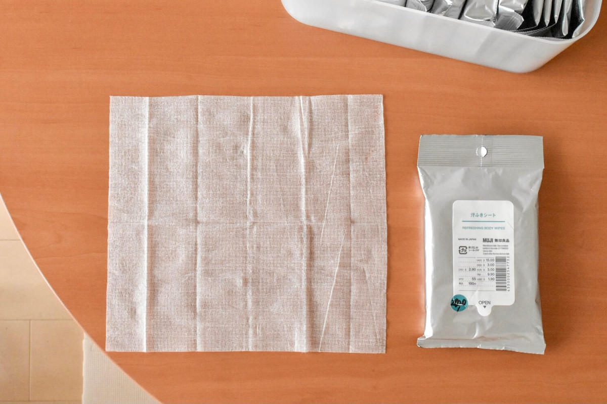 メントールが含まれているので拭くとスッと清涼感がありますが、香りはほぼなし。シートの毛羽立ちもなく全身拭けます。