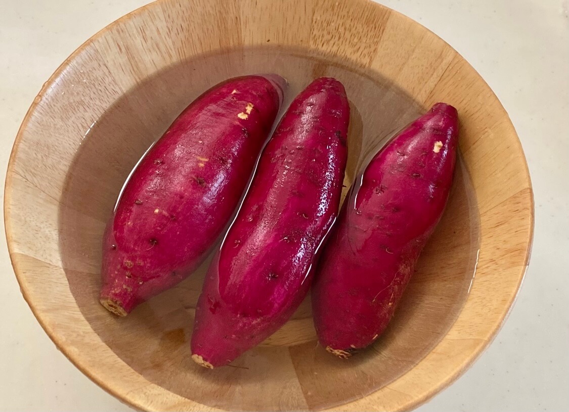 さつまいもは洗った後、30分程しっかりと水に浸けておき、アク抜きをします。