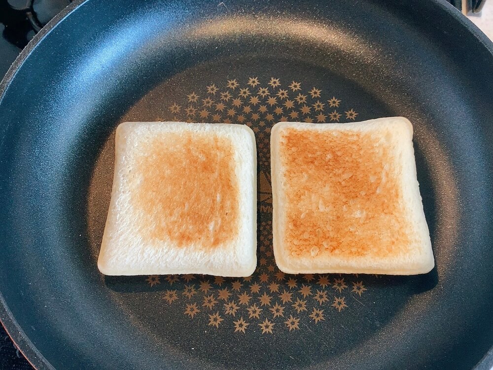 ランチパックをトースターではなくフライパンで焼くと触れている部分だけが瞬時に焼けるので、しっとり感が残りつつモチモチサクサク感が凄くいい感じになる