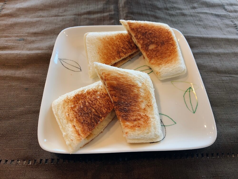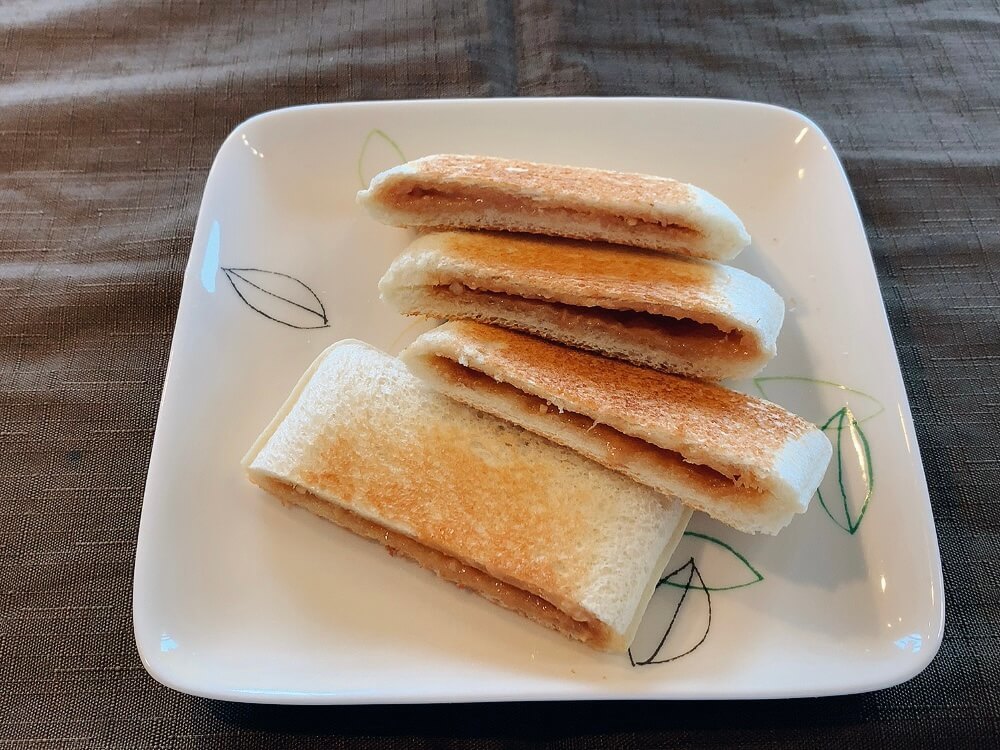 美味しそうな焦げ目がついたランチパックをカットすると、溶けたピーナッツがとろりと広がり出てきました...幸せ!ピーナッツの香りも増し、食欲がそそられます。
