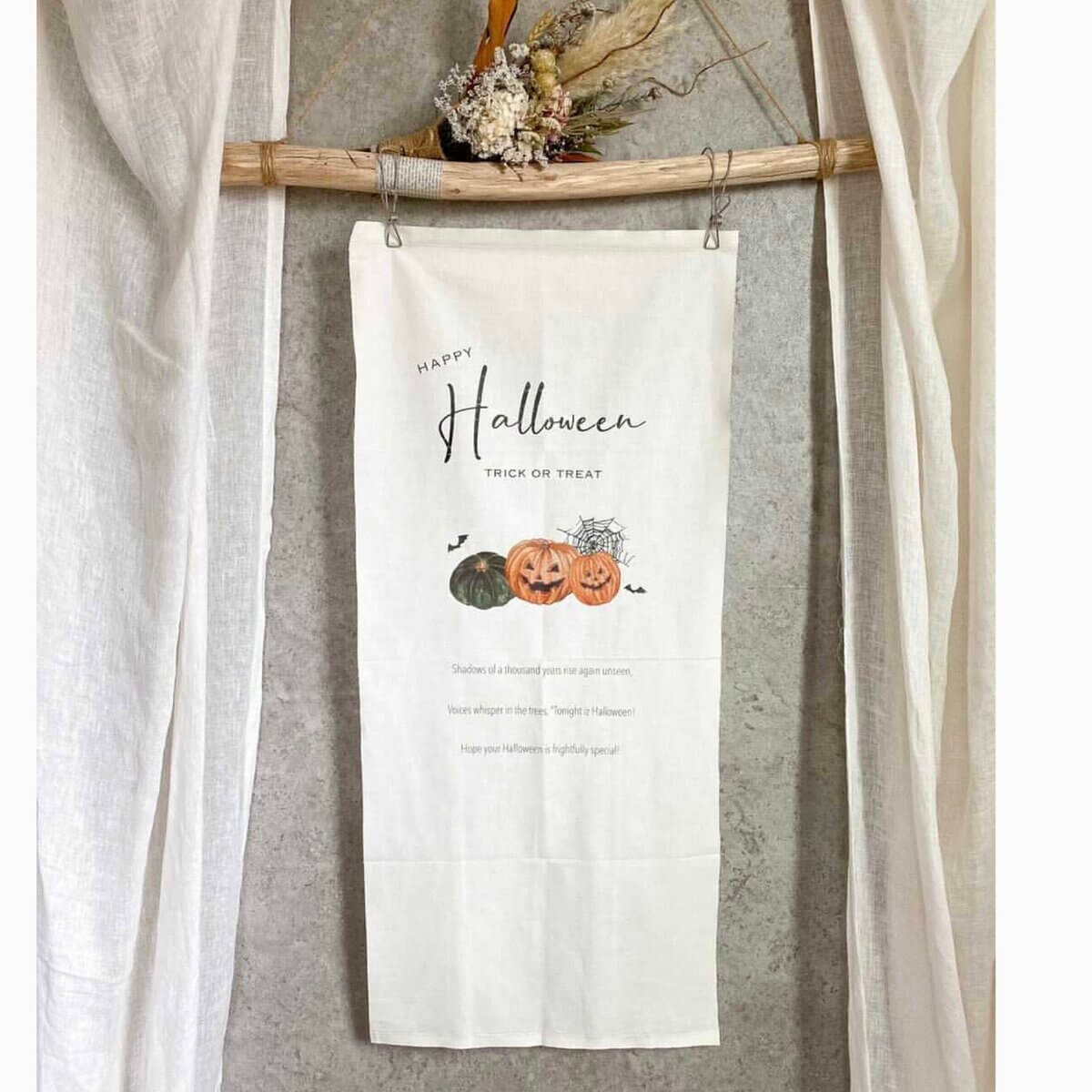 生成り生地のやさしい色合いをベースに、パンプキンとコウモリが描かれている「ハロウィンタペストリー」です。