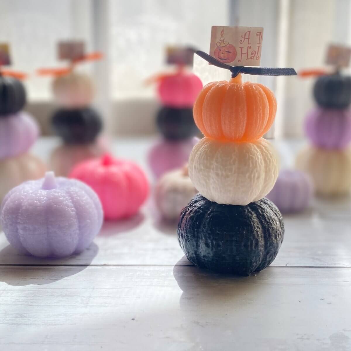 ブラック・ホワイト・オレンジの3色のかぼちゃを積み重ねられた「かぼちゃキャンドル」。落ち着きのある色合いをメインに使われた大人な雰囲気のキャンドルです。