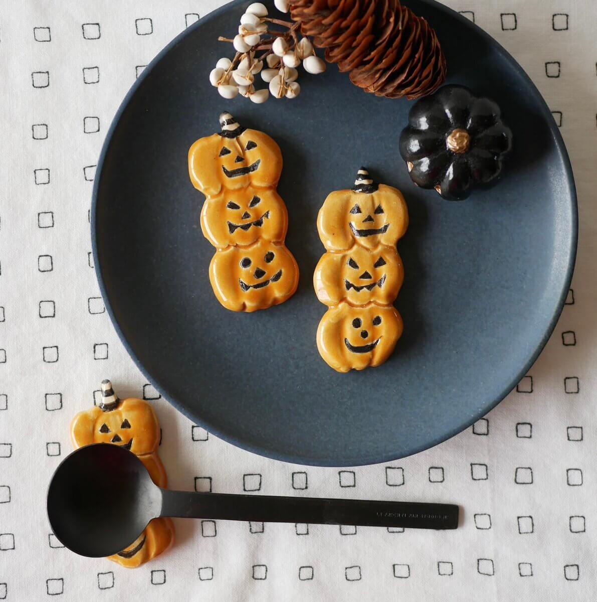 食卓もハロウィン色に染められる「パンプキンの箸置き」です。かぼちゃが3つ積み重なっていて、急いで食べないとかぼちゃに食べられちゃいそう!