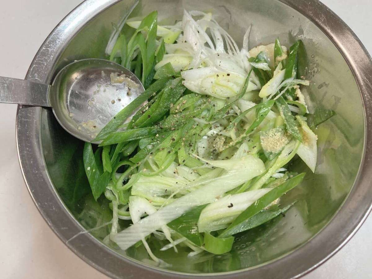 ②長ネギをボウルに入れ、鶏ガラスープの素小さじ2、塩小さじ1、砂糖小さじ1/2、コショウたっぷり、おろしにんにく1/2片、水大さじ2、レモン汁を少々入れ混ぜる