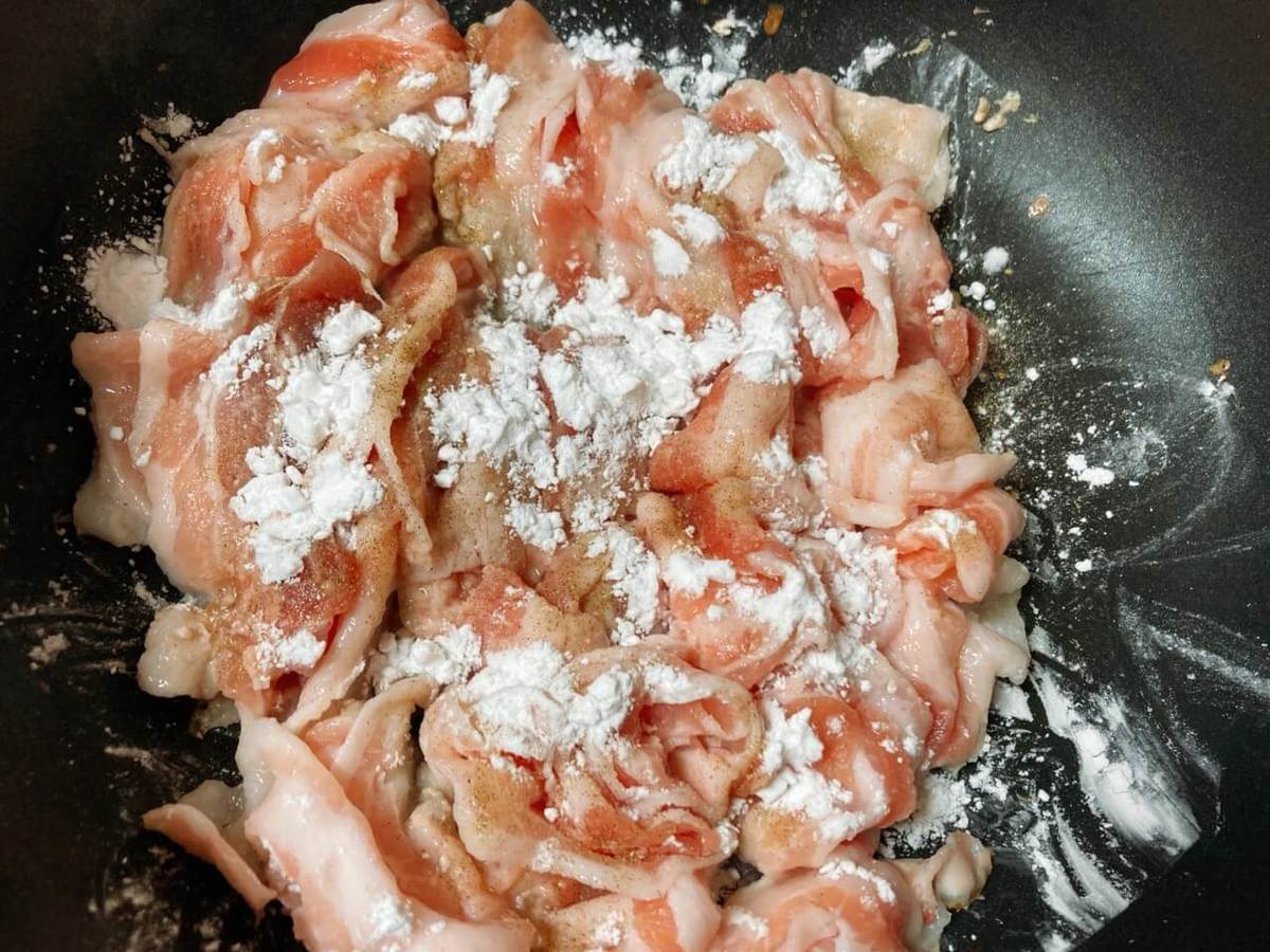②しゃぶしゃぶ用豚バラ肉2パック分に塩2つまみ程度、コショウ、片栗粉各適量をまぶす