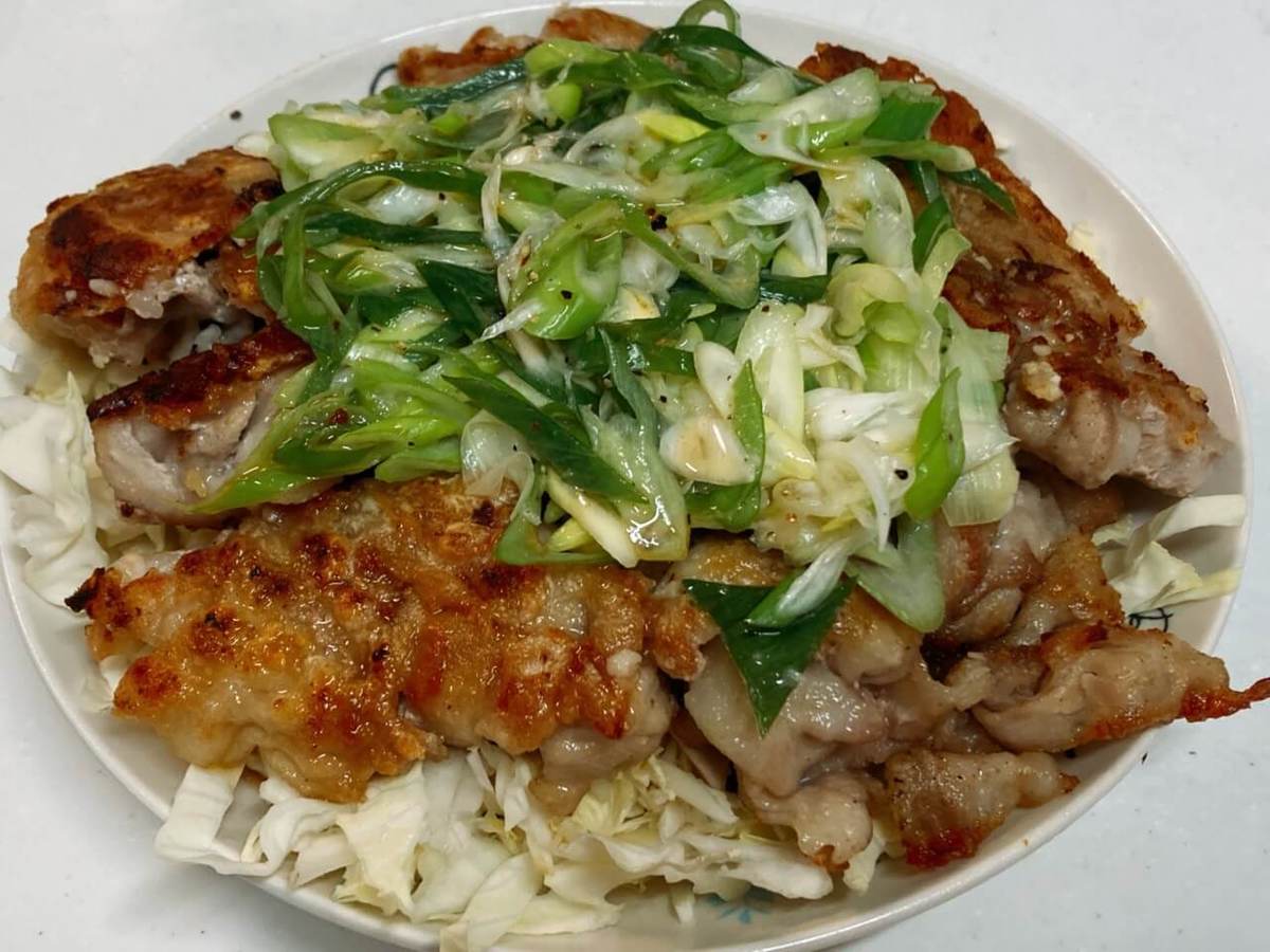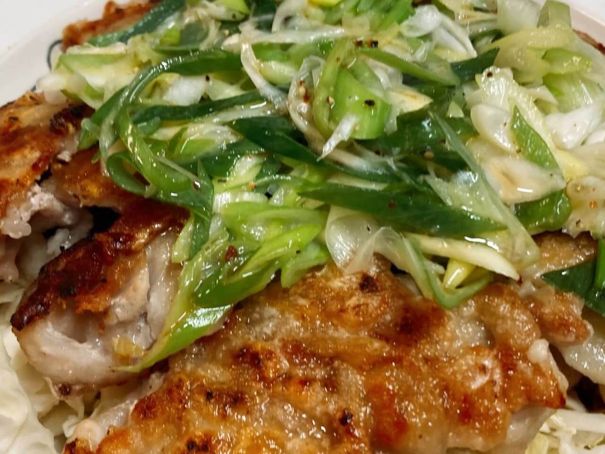 ⑦①に豚肉をのせ、ネギだれをのせる