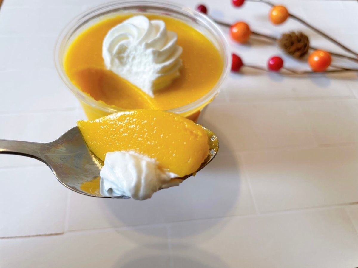 かぼちゃプリンにありがちなザラザラ感は一切なく、信じられないくらいとろーりなめらか。かぼちゃそのものの甘さが生かしてある、とっても優しい味わいです。