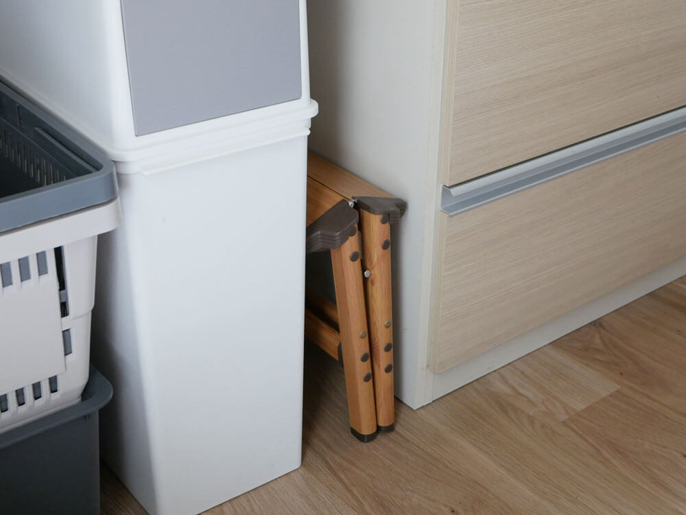使わないときはサッと畳んでスリムに収納できます。 折り畳み時の厚みは、1段タイプも2段タイプも約15㎝ほど。 キッチンやクローゼット、パントリー内でのちょっとした隙間に自立して収納できます。