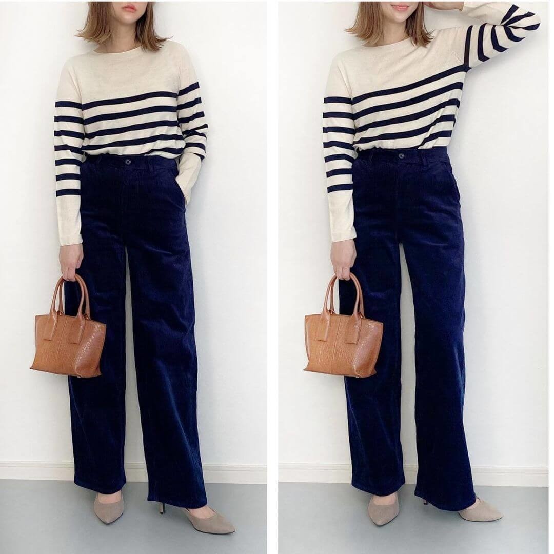 ネイビーのコーデュロイパンツを着こなした、大人シックな秋のカジュアルコーデ。