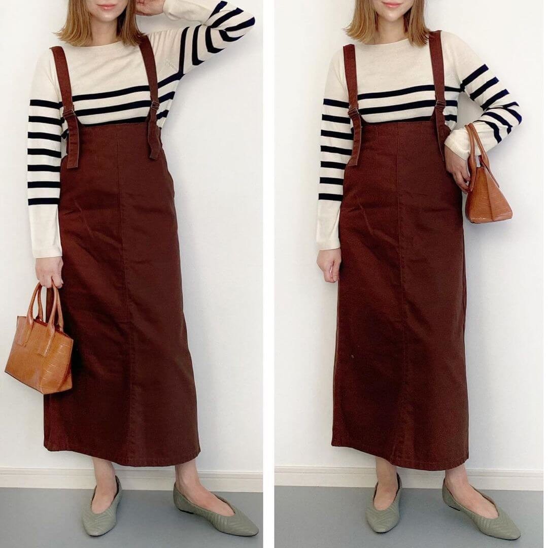 ブラウンのサスペンダースカートとコーディネートしたスタイルで、秋らしい季節感をキャッチ。