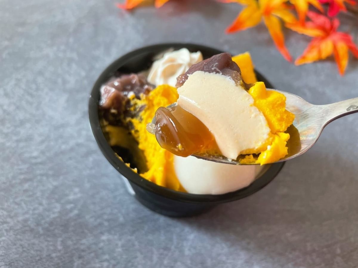 スプーンですくってみると、安納芋のムースと黒蜜わらび餅が顔を出します。