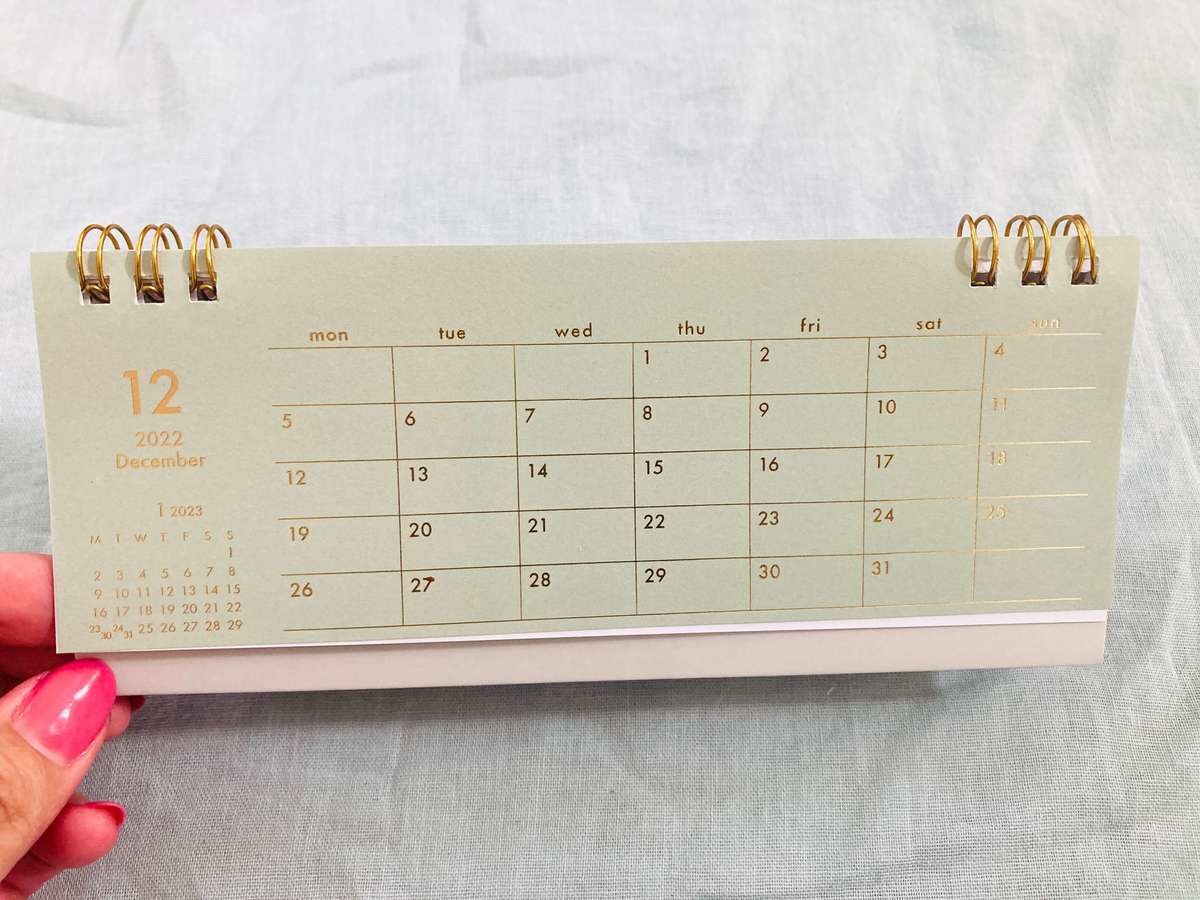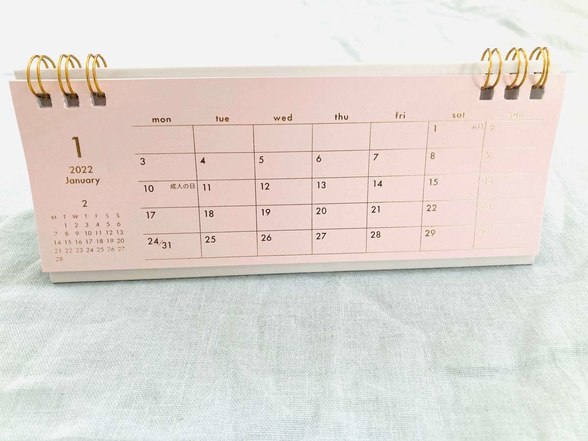 くすみカラーやフランフランっぽい雑貨が大好きな人におすすめなのが、「卓上カレンダー 横長シンプルカラー 110円(税込)」です。ゴールドでプリントされた文字と高見えデザインに、ひと目見て購入を決めました♪