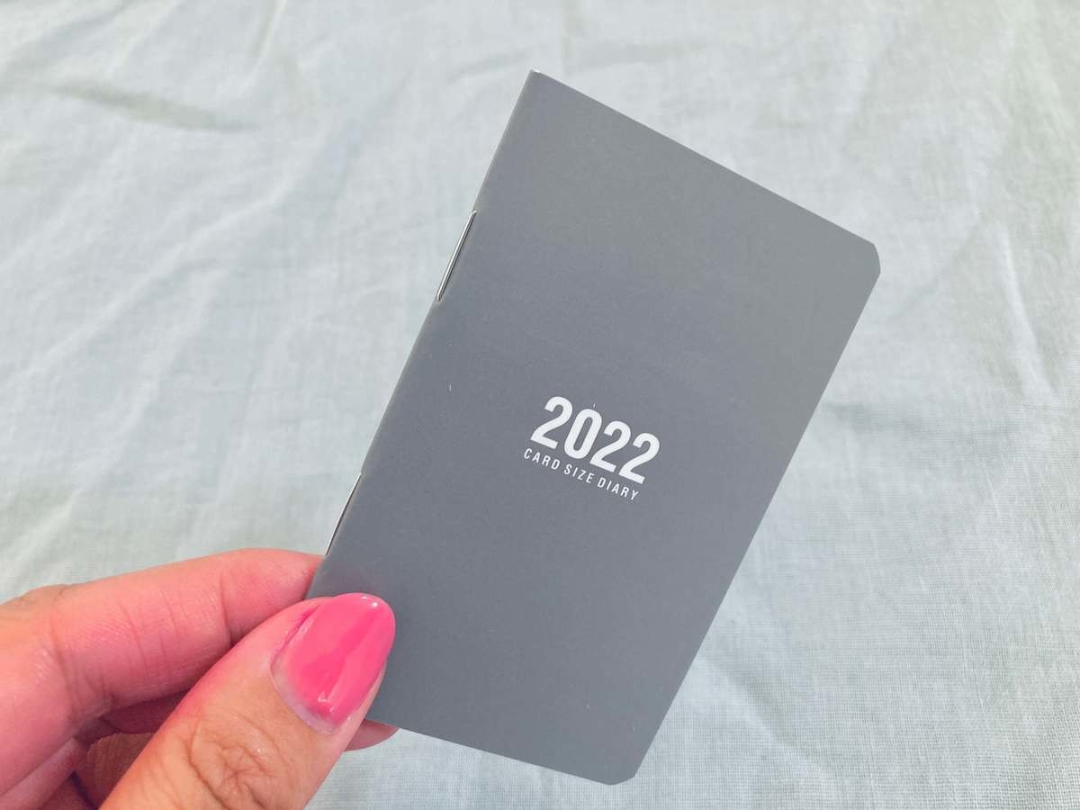 あまりの小ささと売れ筋に二度見したのが「2022年カードサイズダイアリー 110円(税込)」です。財布やカードケースに収納するためのコンパクトなサイズが大人気!最寄りのセリアではラスト2個でした!