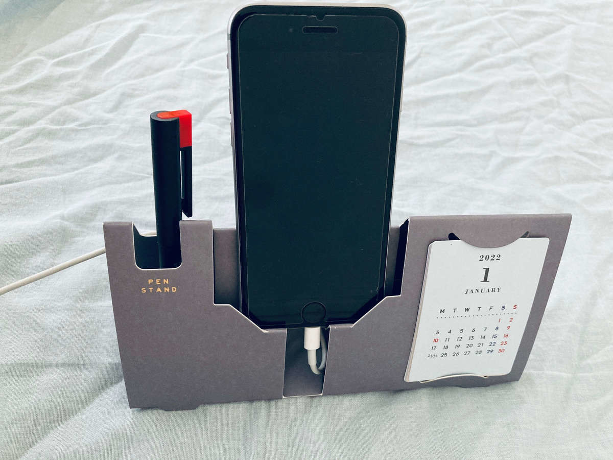 すごいところは、カレンダーだけでなく、スマホスタンドとペンスタンド、小物入れがセットになっているんです。