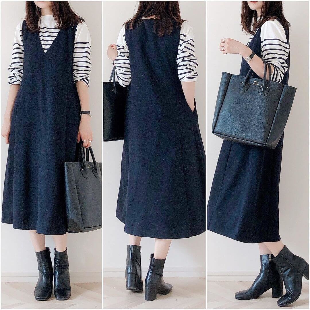 ジャンパースカートのインナーとしてボーダーTを組み合わせて、可愛らしい大人のオフコーデを演出。