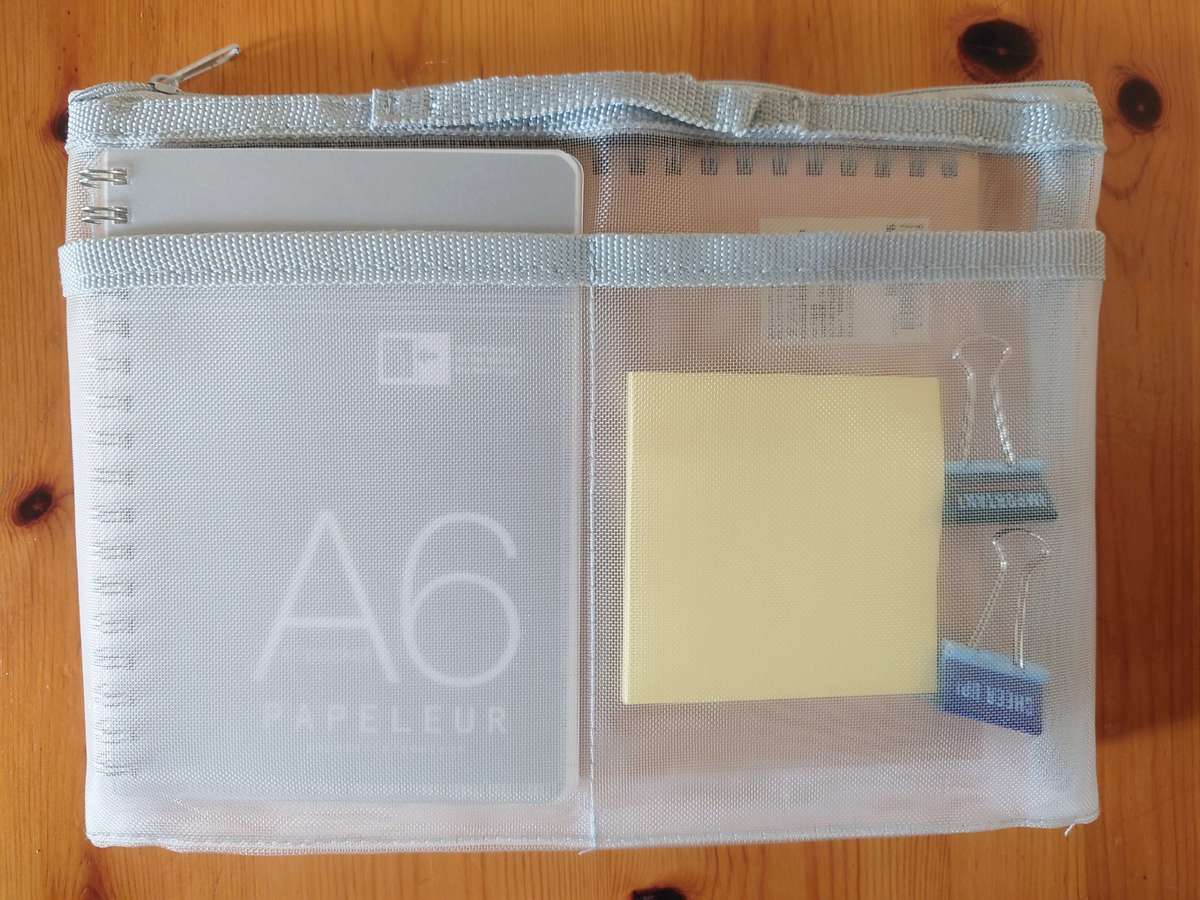 メインポケットには、A5ノートがスッポリ入ります。ペンケースがなくてもこのバッグインバッグがあればOKかも!?