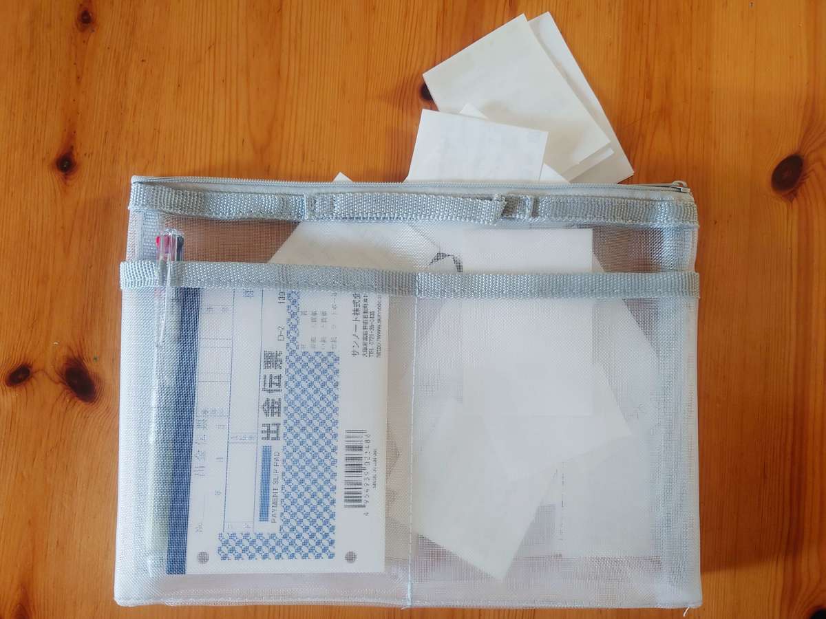 私は今までジッパー袋に貯めていましたが、このバッグだと手前のポケットに伝票束やペンもさせるので、セットにしてまとめておくにも活躍します。