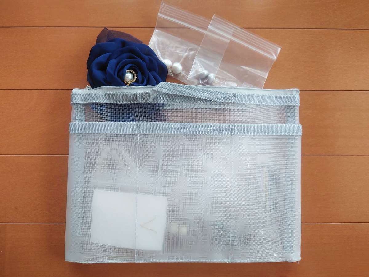 小さいチャック袋に使わないアクセサリーを詰めて、このバッグインバッグにまとめてしまえば、すっきり収納できました。