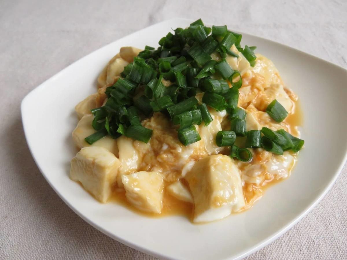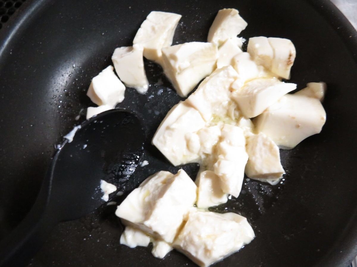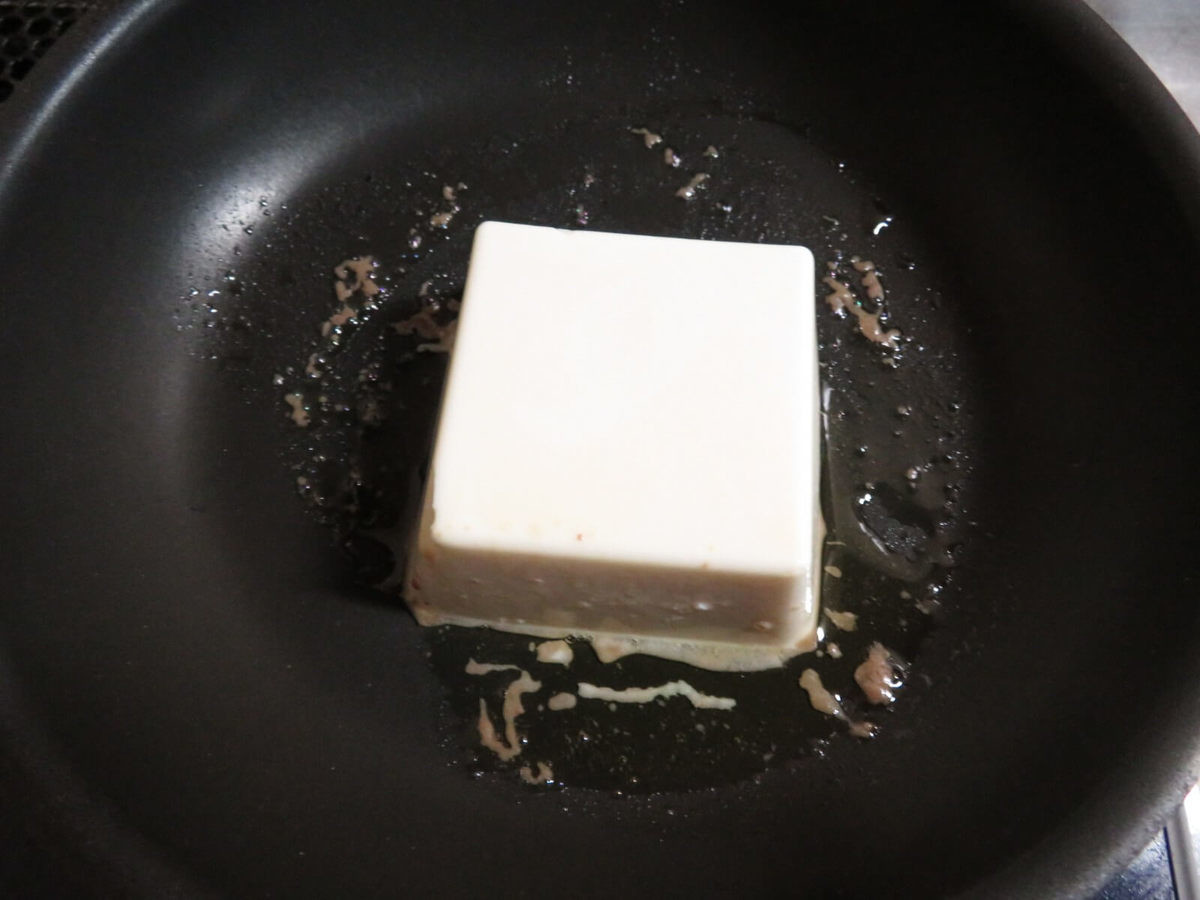 フライパンにオリーブオイルと少量のアンチョビペーストを入れて中火にかけ、水気を切った絹ごし豆腐をそのまま投入!