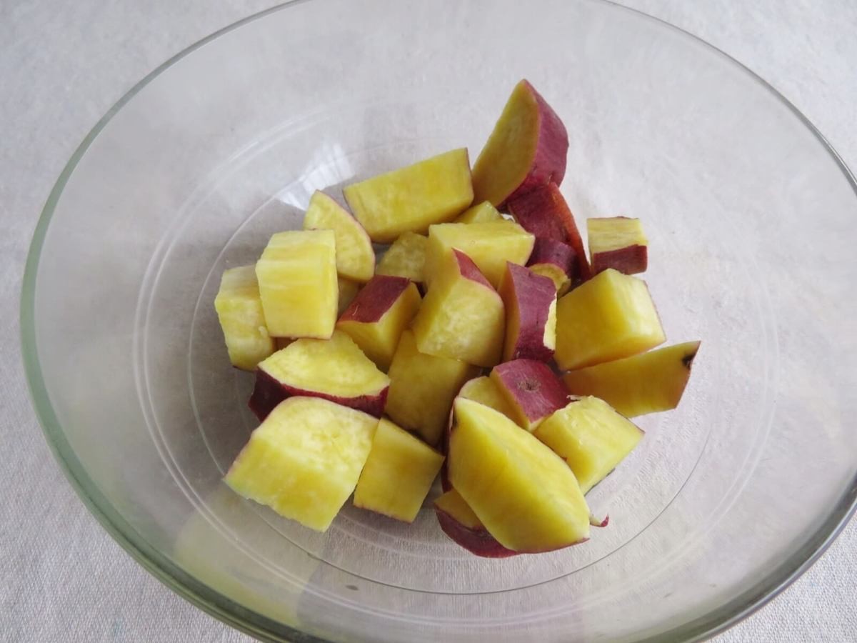 さつまいも(1本)を一口大に切り、水にさらしてあく抜きを。水を切って軽くラップをかけたら、電子レンジで加熱します。(600Wで約4分)