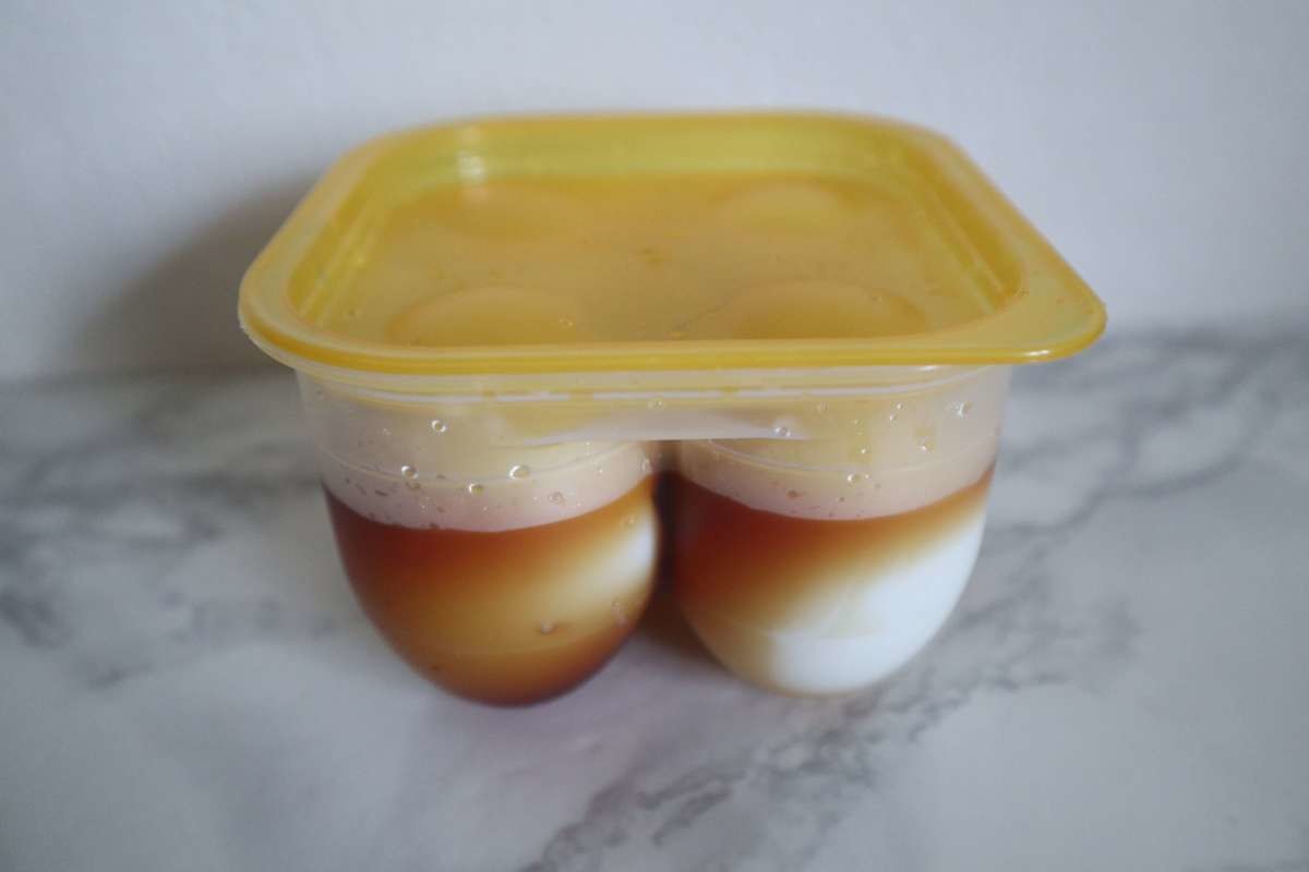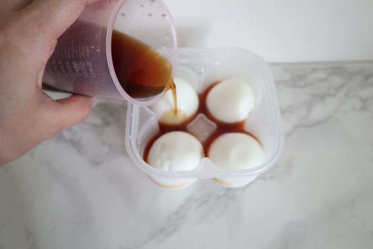 殻をむいた茹で卵を容器にセットし、麺つゆ(ストレート)を内側上部にある線まで入れます。