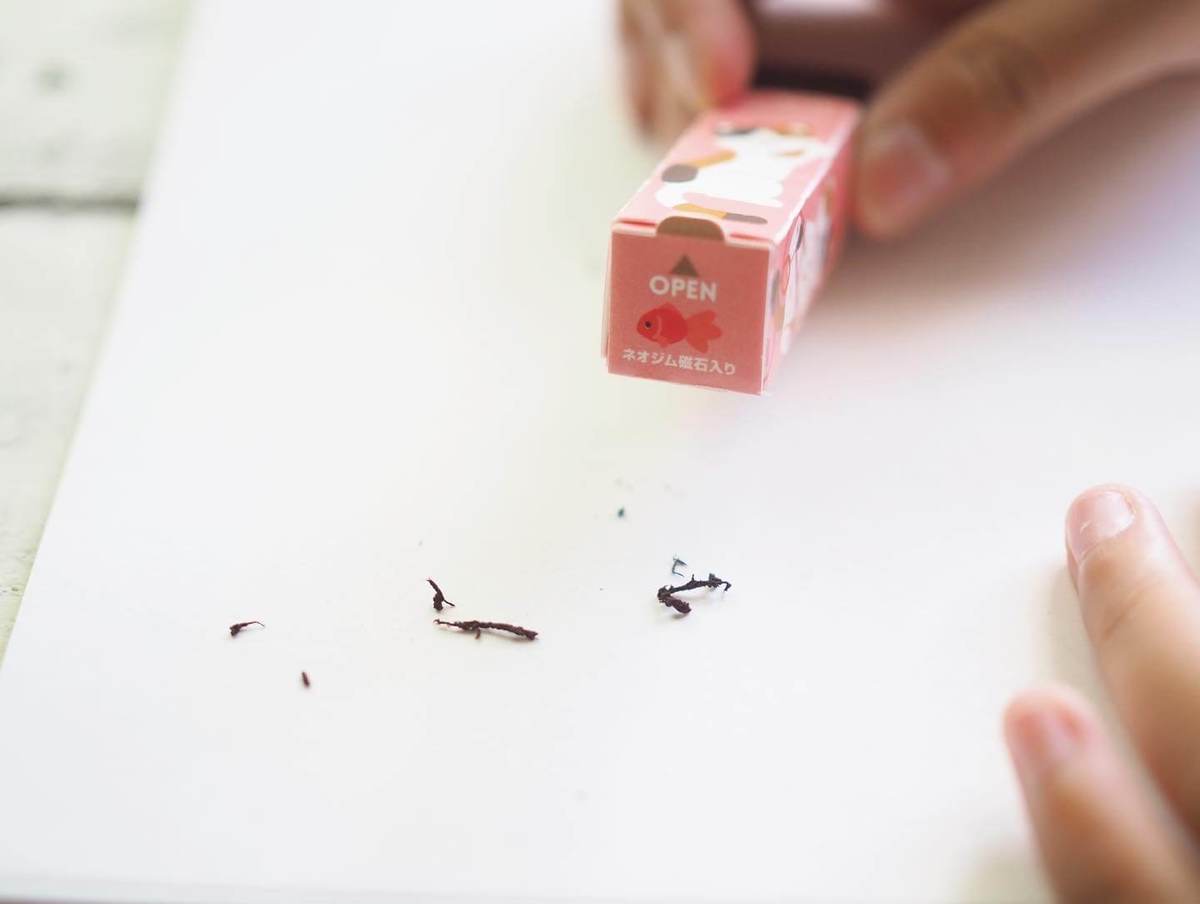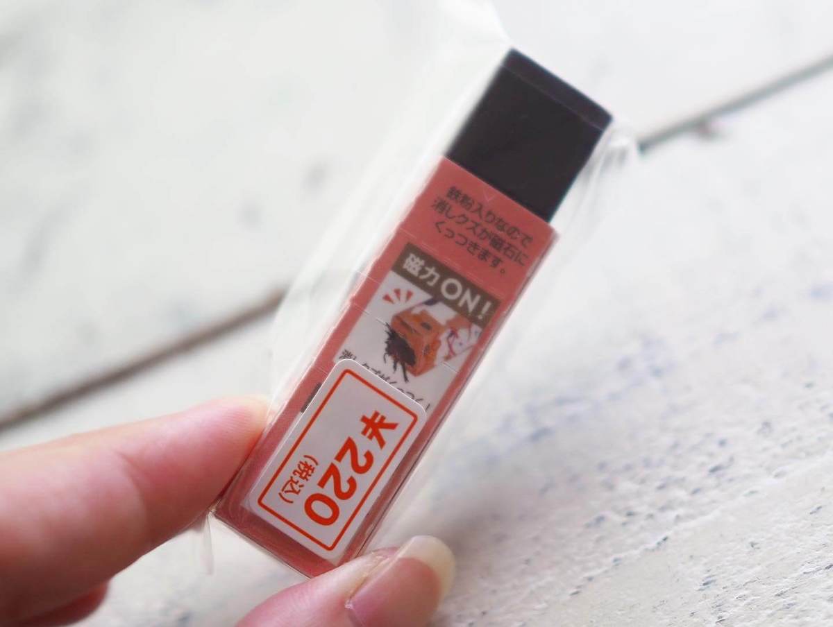 見た目はシンプルな消しゴムですが、消しゴムに鉄粉が入っていてケースの底にある磁石で消しクズを集められるというスグレモノなんです……!