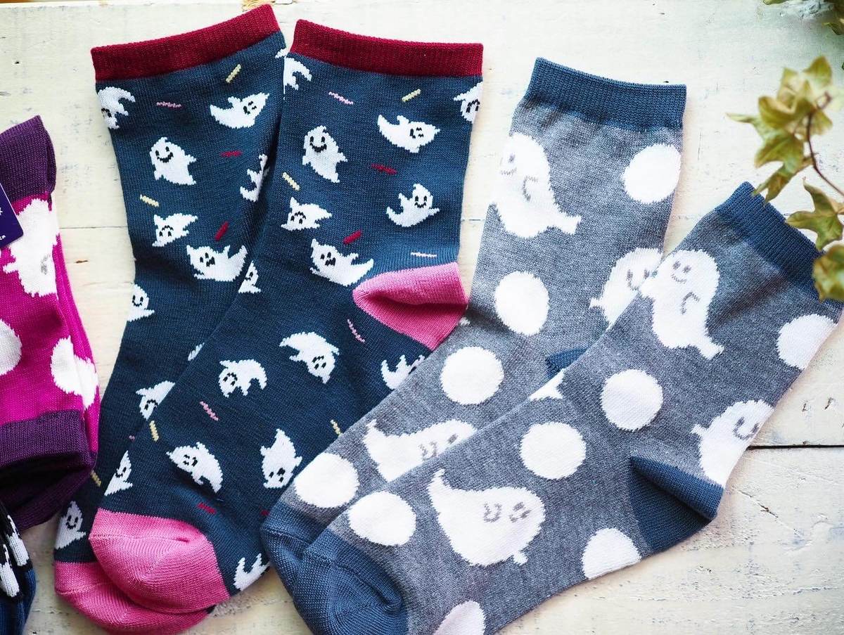 キュートなおばけ柄の靴下で、サイズは23-25cmと22.5-24.5cm展開なので親子お揃いもできますよ。