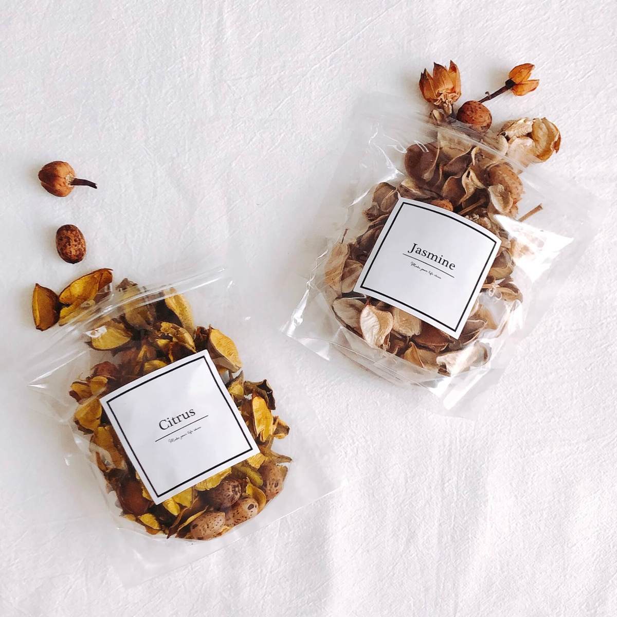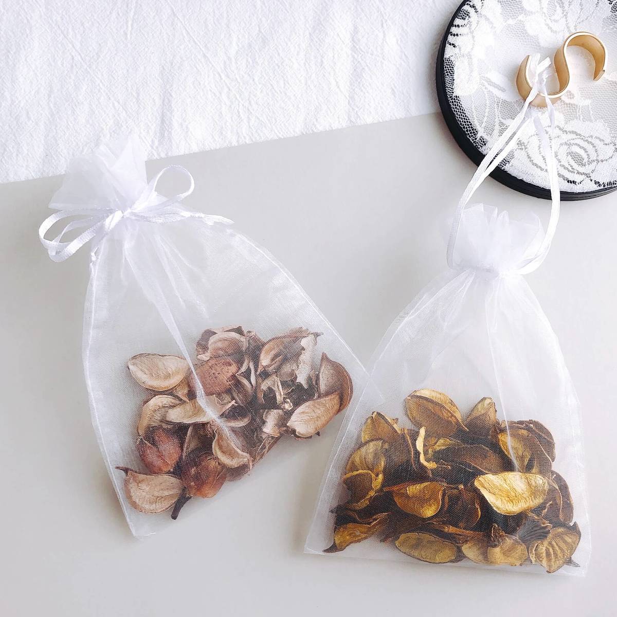 瓶に入れてそのまま置いたらインテリアに!透け感のある袋や巾着に入れると、トイレやお部屋に掛けてもおしゃれでほんのり香ります。