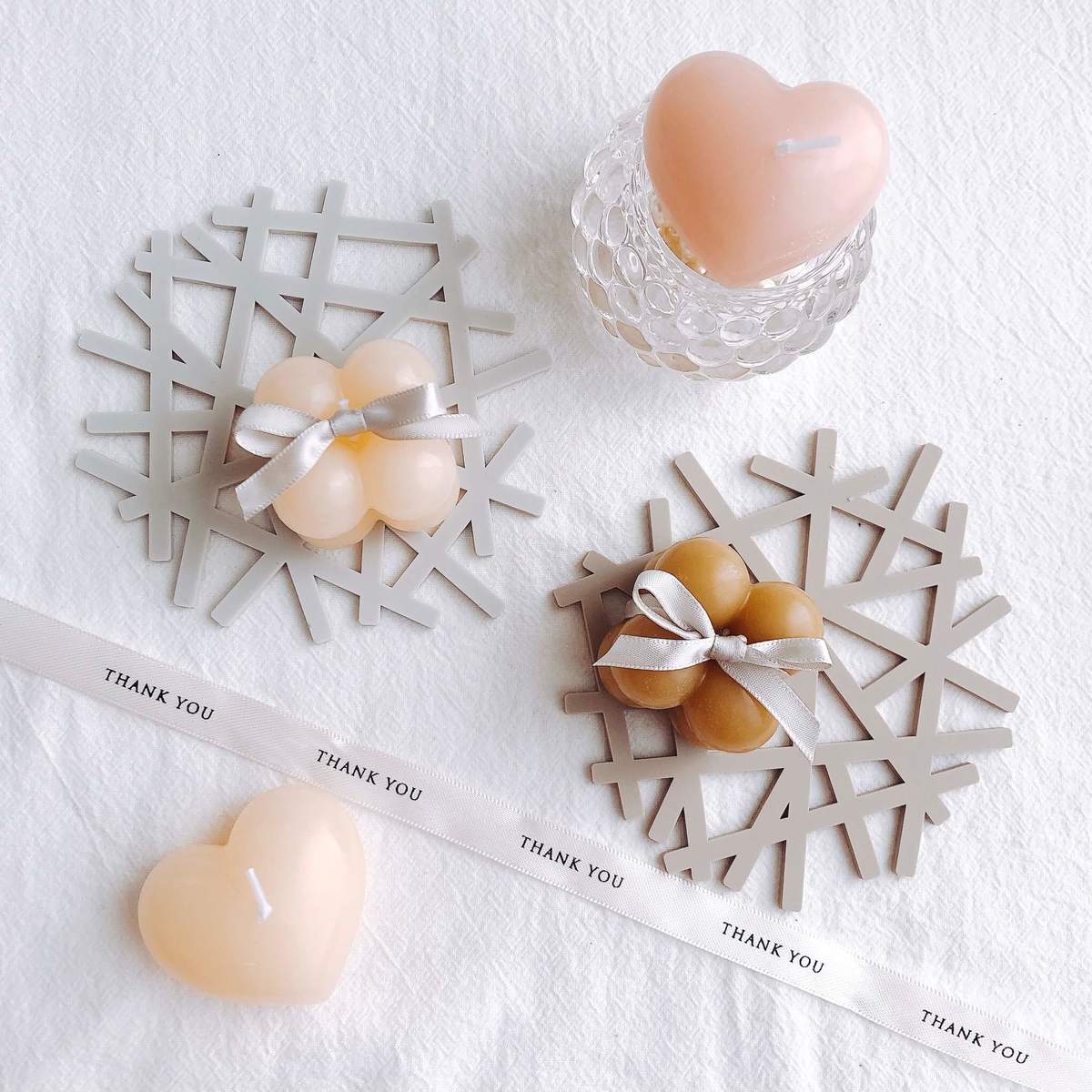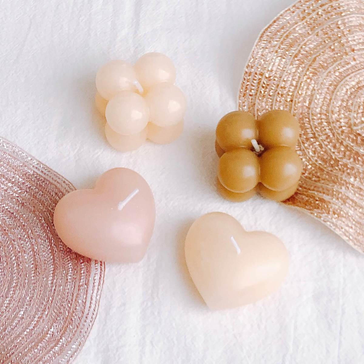 各2色ずつあり、ハート型もとってもかわいいです。マットの上に置いたりそのまま飾っても映えること間違いなし!