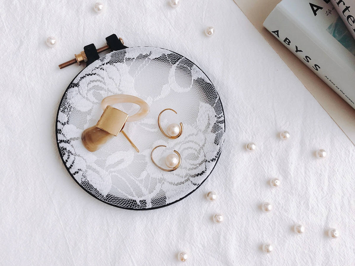 写真のようにアクセサリーを置いたりレースにピアスを掛けてディスプレイすることができます♪