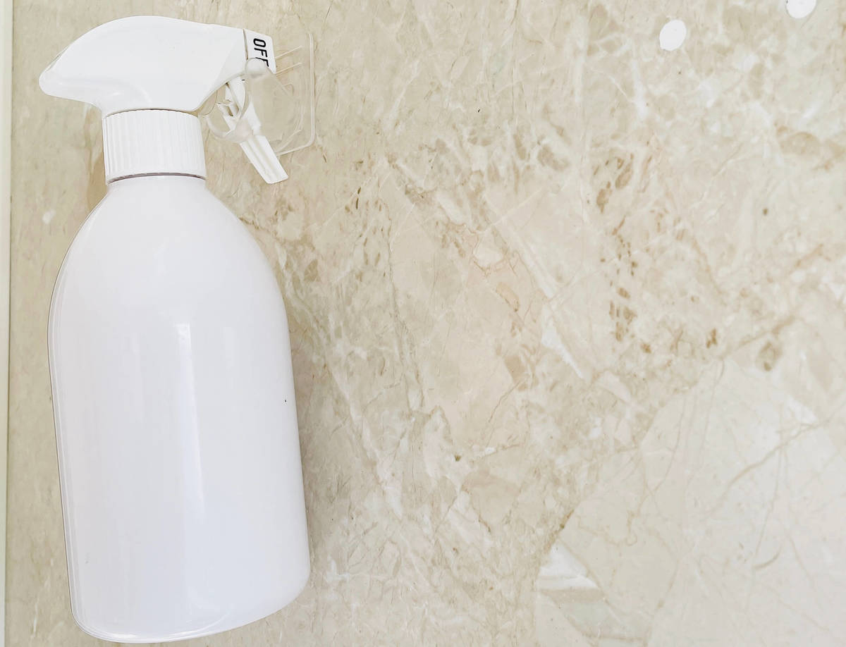 お風呂場の壁に貼り付けスプレーボトルを掛けてみました。