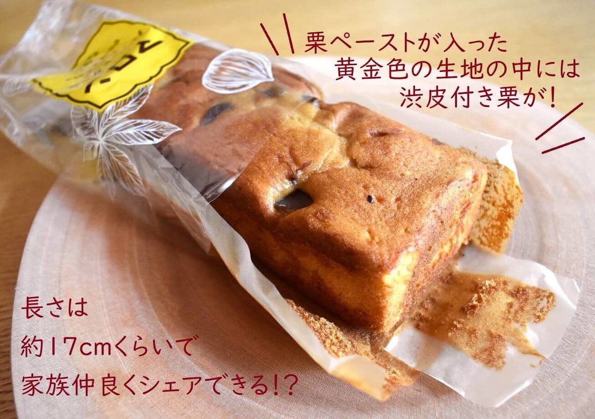 焼き菓子に定評のある「サンラヴィアン」が製造しているので、その味も本格的。栗のペーストが生地に練り込まれている上に、渋皮付きの甘露煮の栗がアクセントとして入っています。