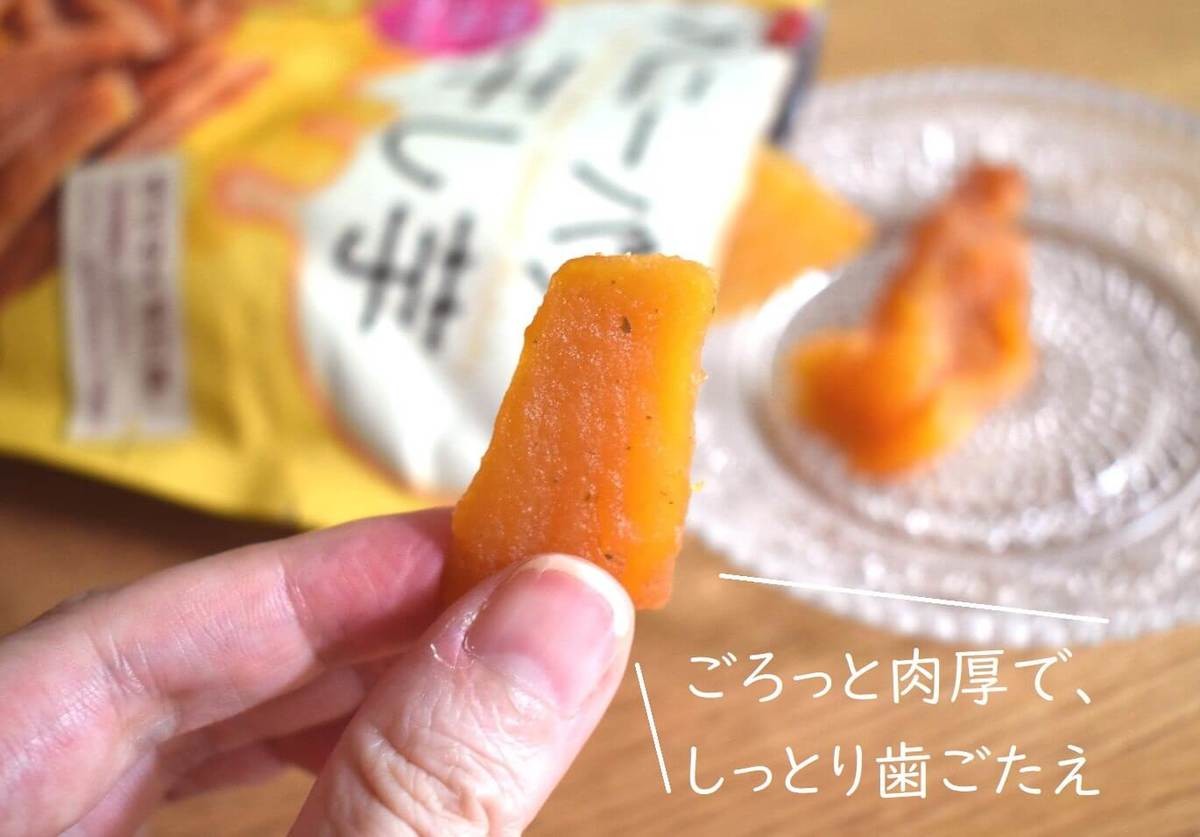さっそくひとくち食べてみると、歯ごたえがしっかりある肉厚な干し芋です。口に入れた途端バターの香りが広がり、その味は干し芋というより「スイートポテト」に近く感じます。