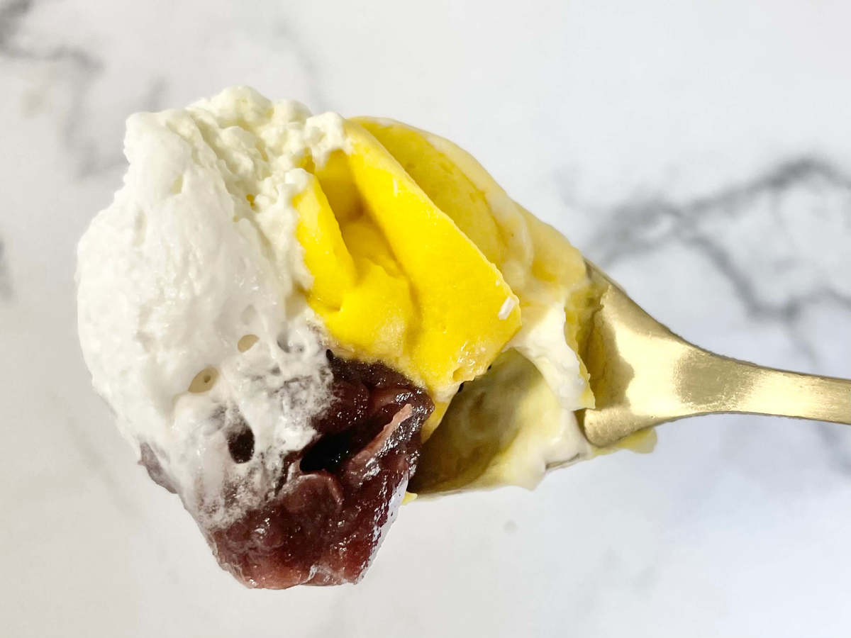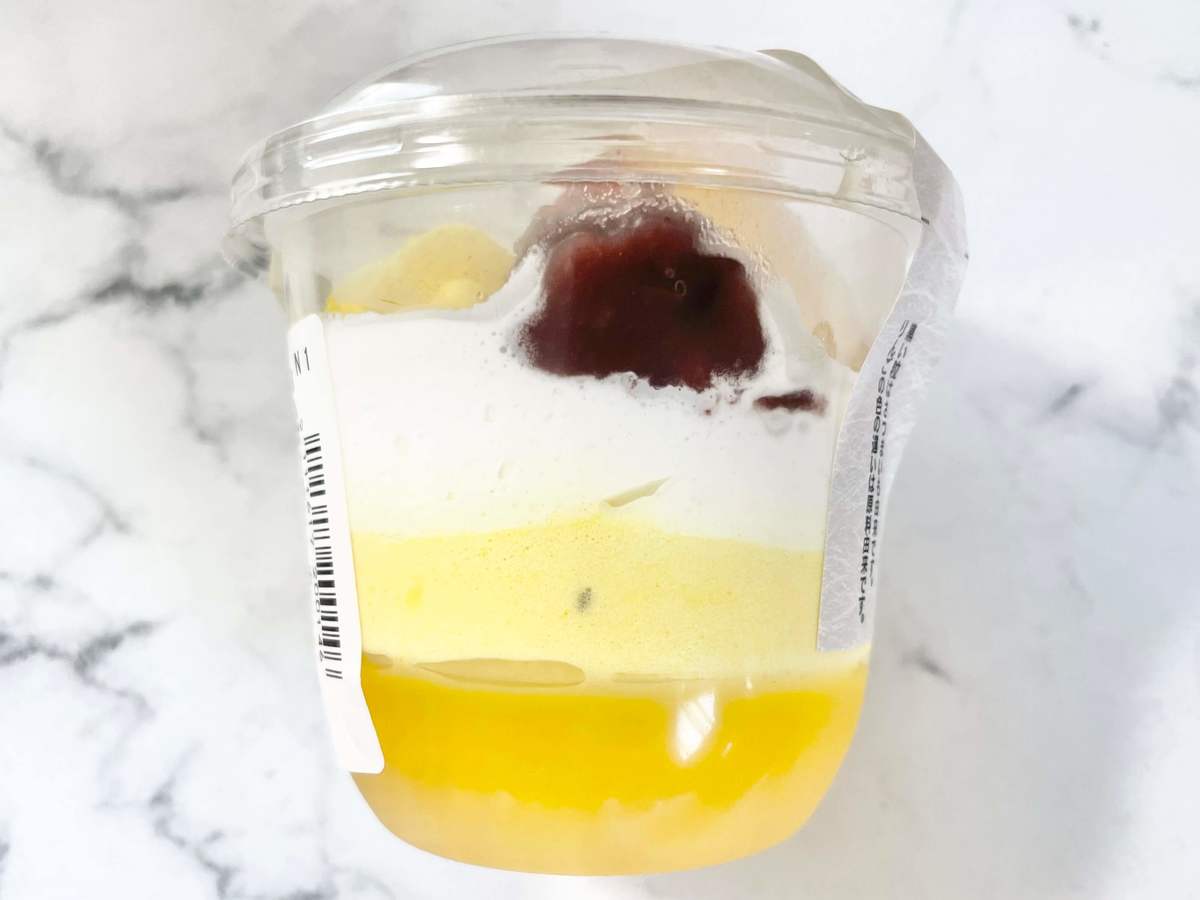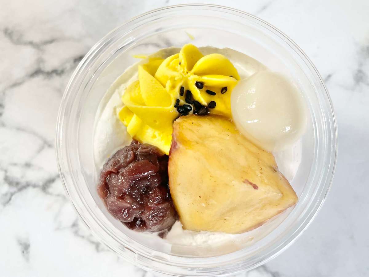 下から角切りりんごの入った寒天、さつま芋ホイップが重ねられ、素揚げにしたさつま芋、芋あん、粒あん、白玉がトッピングに!