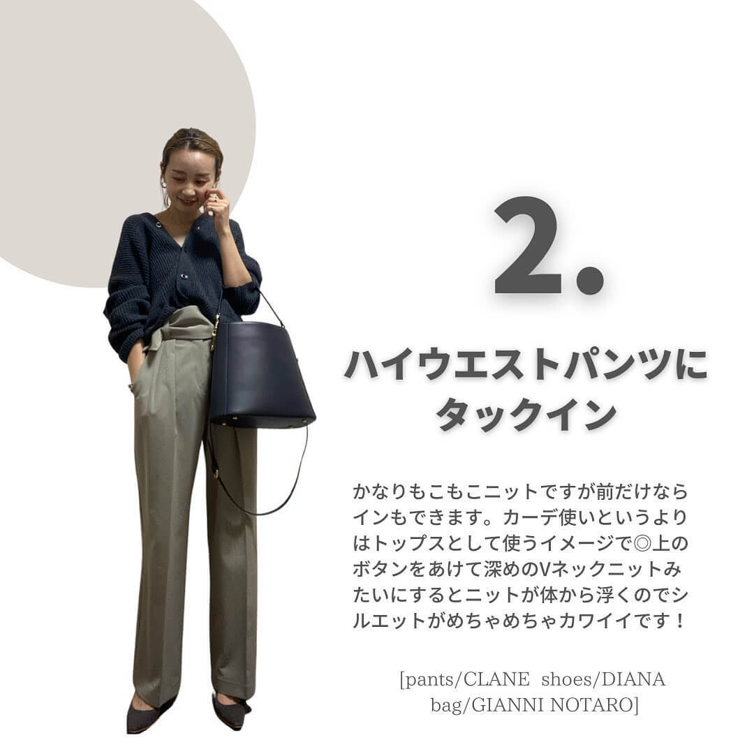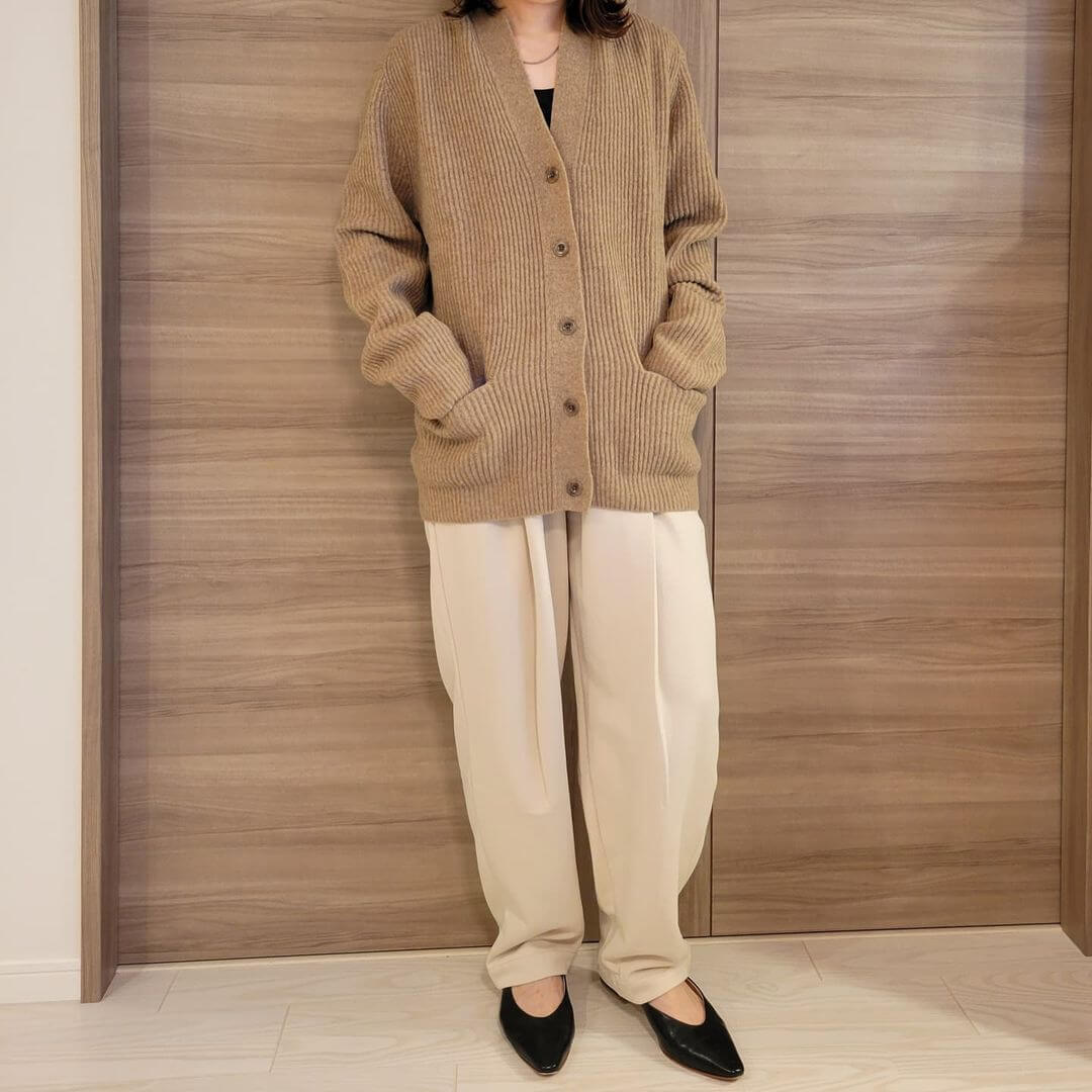 オーバーサイズのニットカーデも、テーパードパンツなら女性らしく着こなせます。