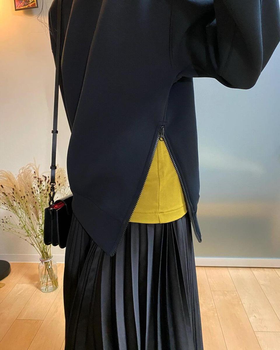 ユニクロ×セオリーの「プリーツラップスカート 」合わせのモノトーンコーデ。