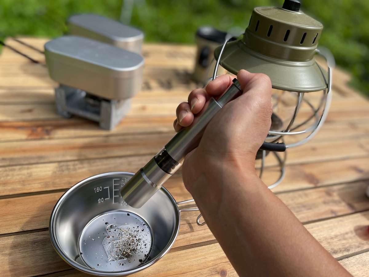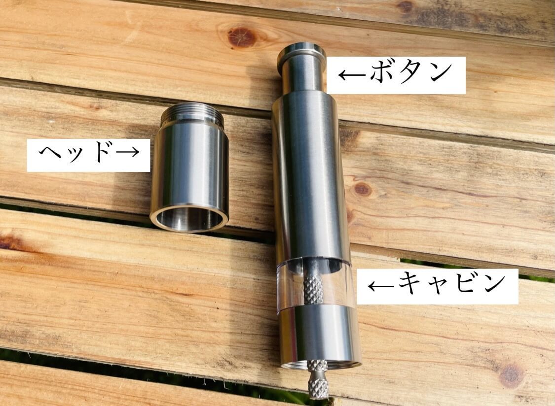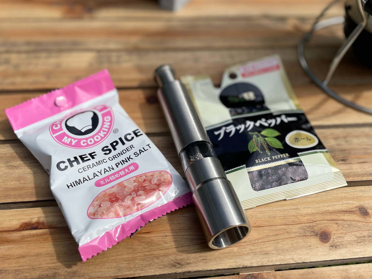 ここでは、ダイソーで購入した見た目も良いのに使い勝手も最高のアイテム「ワンハンドスパイスミル」です。キャンプにもおススメですよ。