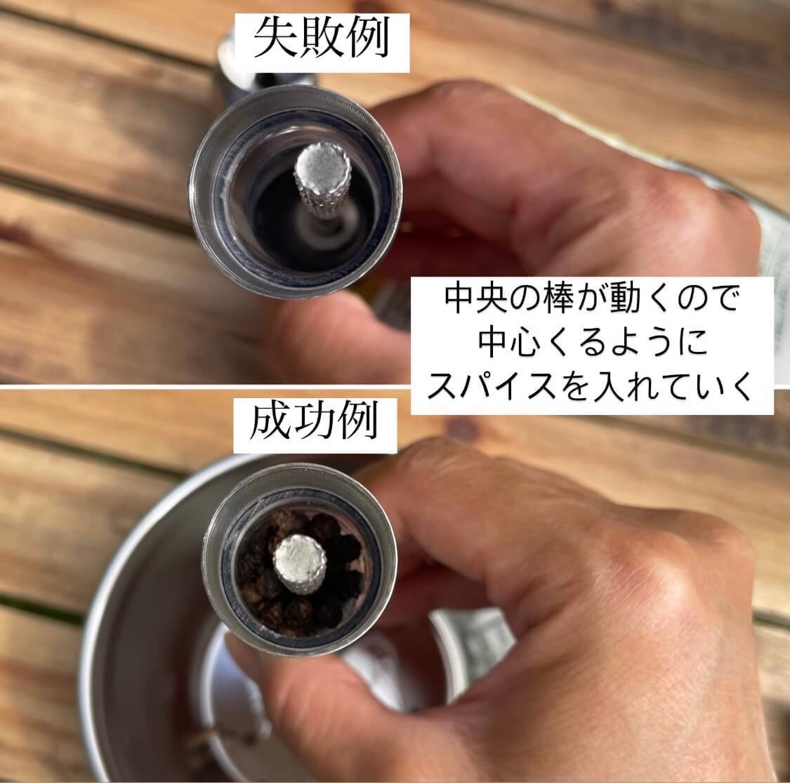 この時、中央の棒が中心からズレた状態でブラックペッパーを入れていくと、ヘッドを閉める事が出来なくなりますので、棒が中心からズレないように気をつけながら入れていきます。