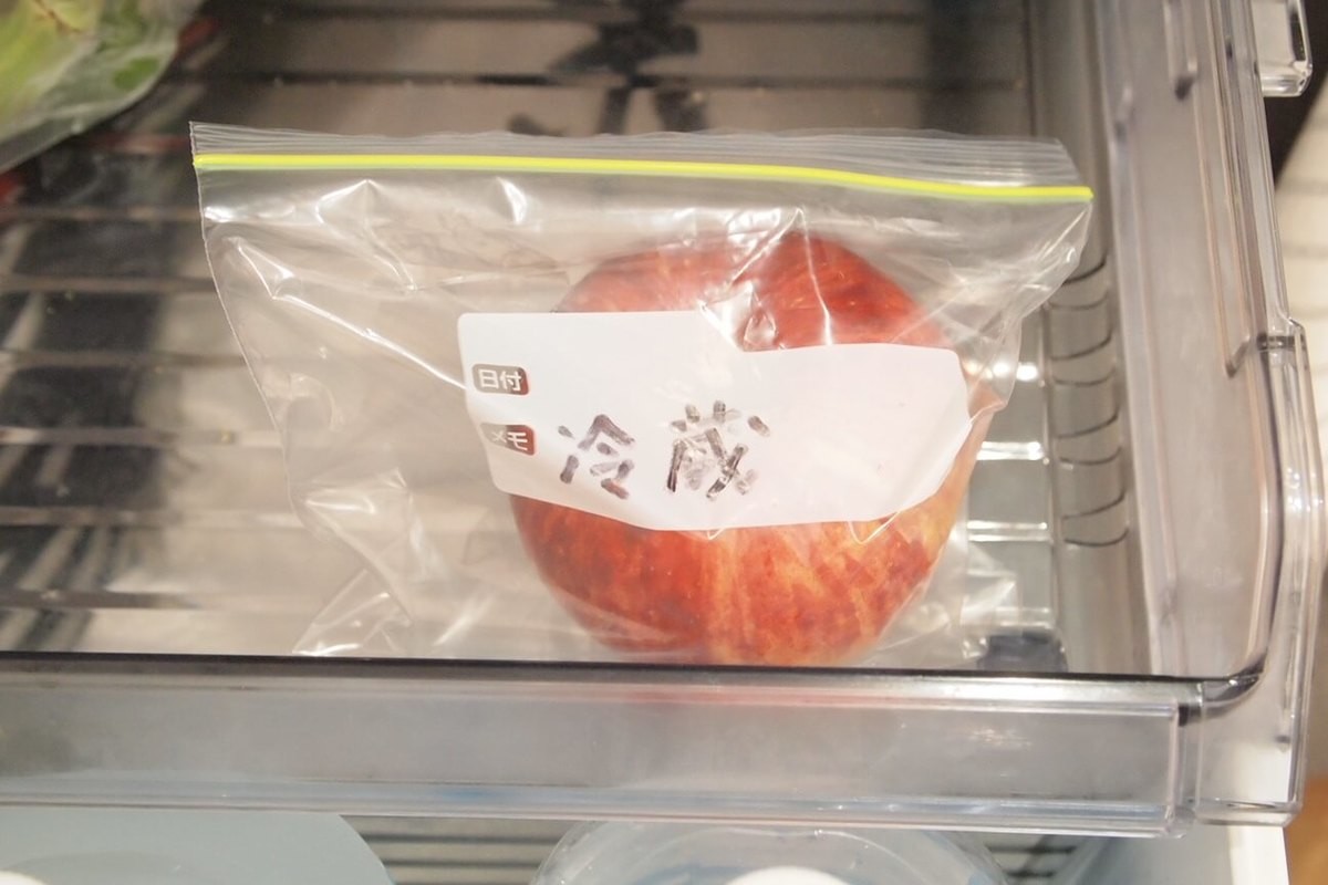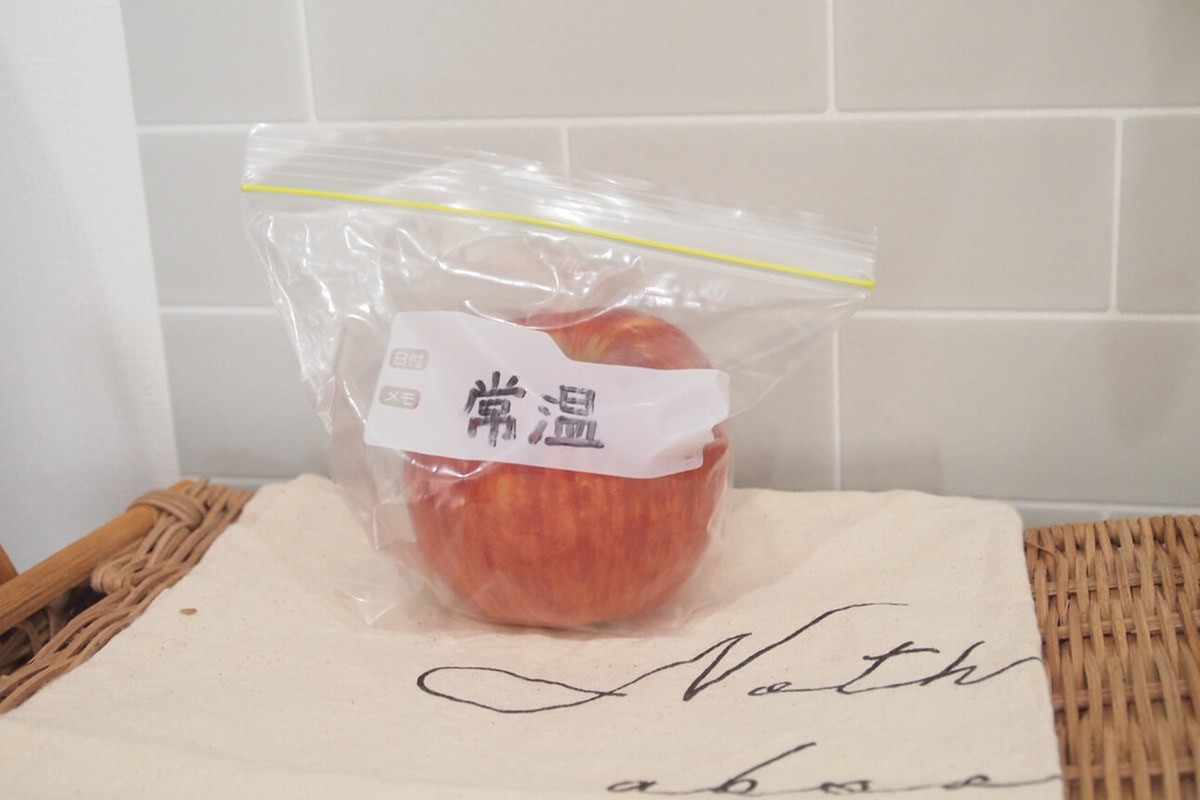 今回の検証方法は、同じ日に購入したりんごを密閉式保存袋に入れて、1つは野菜室に、もう1つはキッチンカウンターに置いて常温で保存します。
