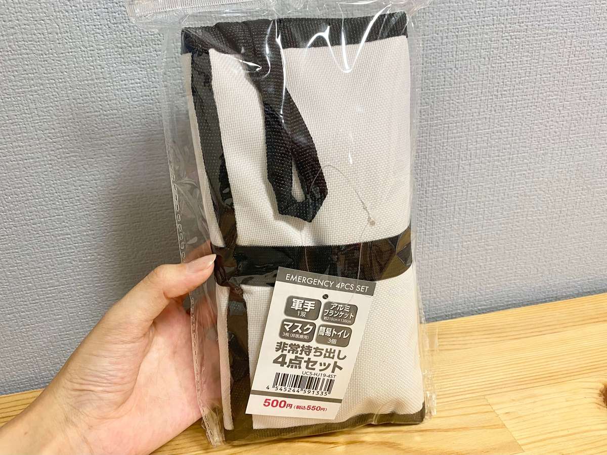 ダイソーで発見し、これはめちゃくちゃ優秀だ!と即ゲットしたアイテムが、こちらの「非常持ち出し4点セット(550円 税込)」です。