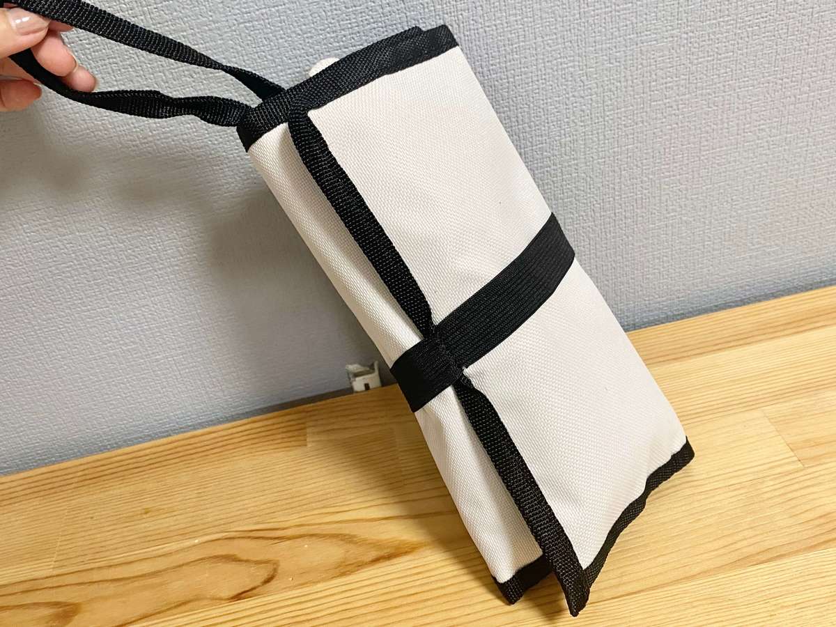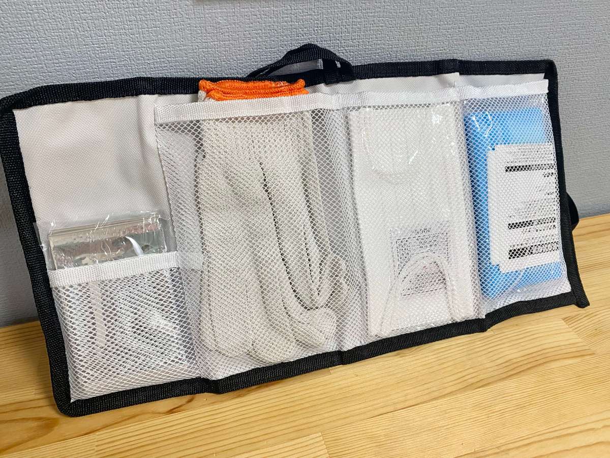 くるくると巻いてコンパクトに持ち運べるポーチのような形状で、写真のようにポケットが4つあり、非常時にも役に立つツールが入っています!