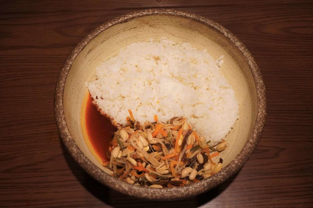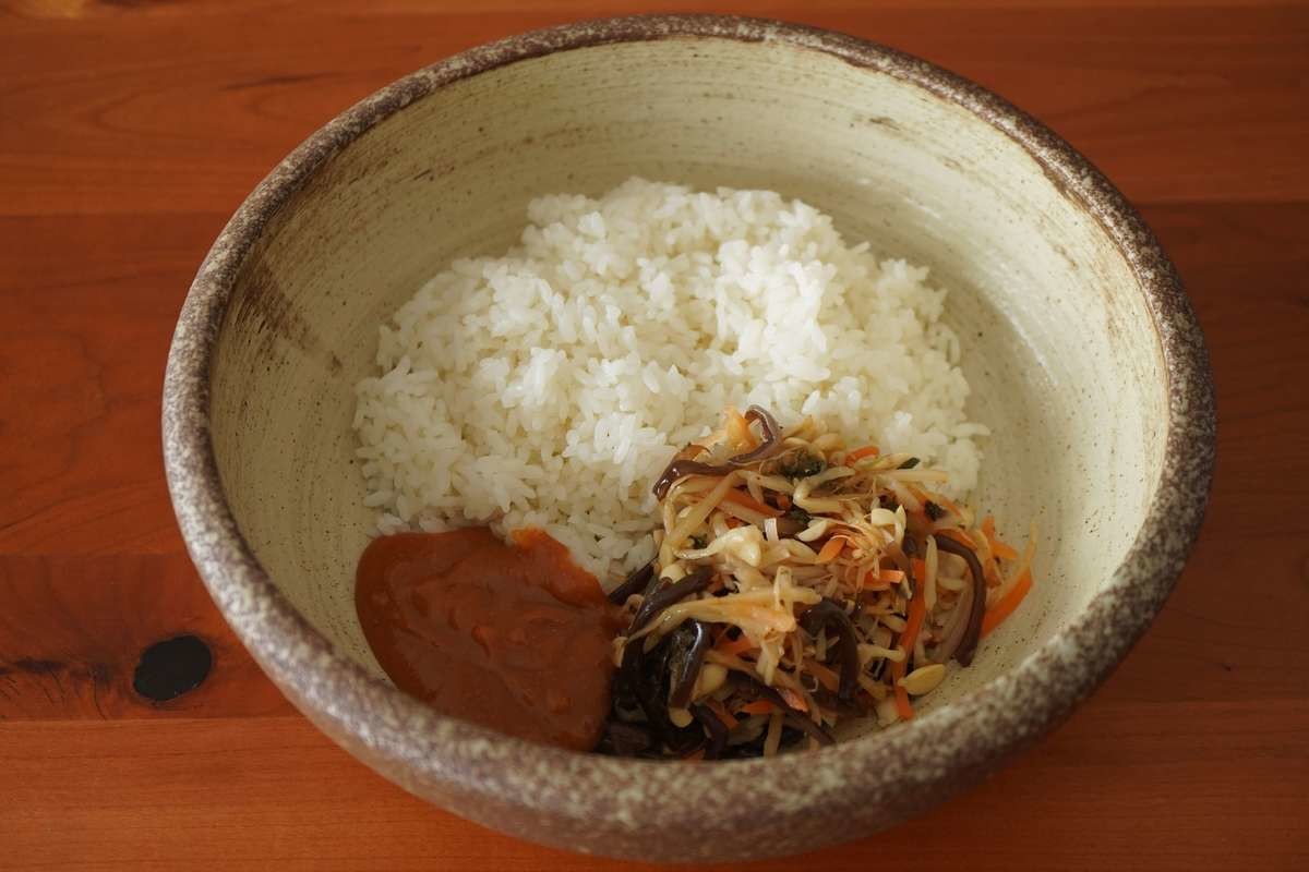 2. 大きめの器に温かいご飯(360g)、野菜ビビンバの具、旨辛コチュジャンだれを入れてよく混ぜます。