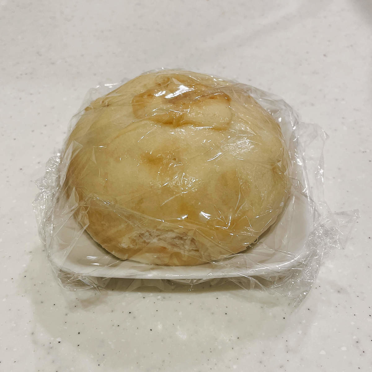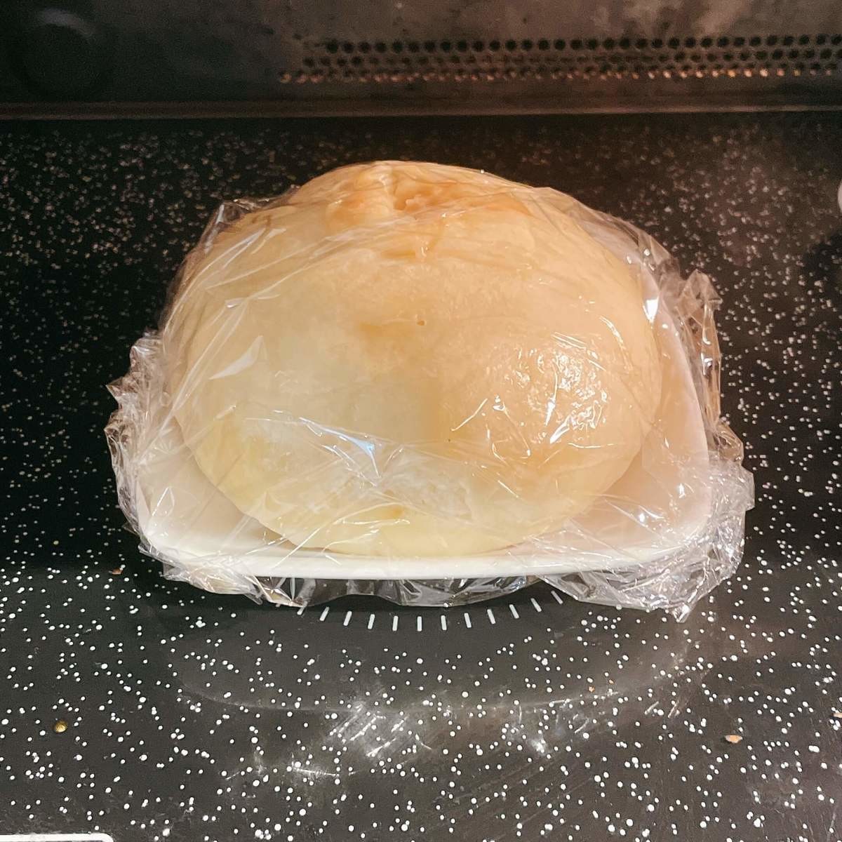 次に軽く水で濡らした肉まんを耐熱皿に乗せ、ふんわりラップをかけます。