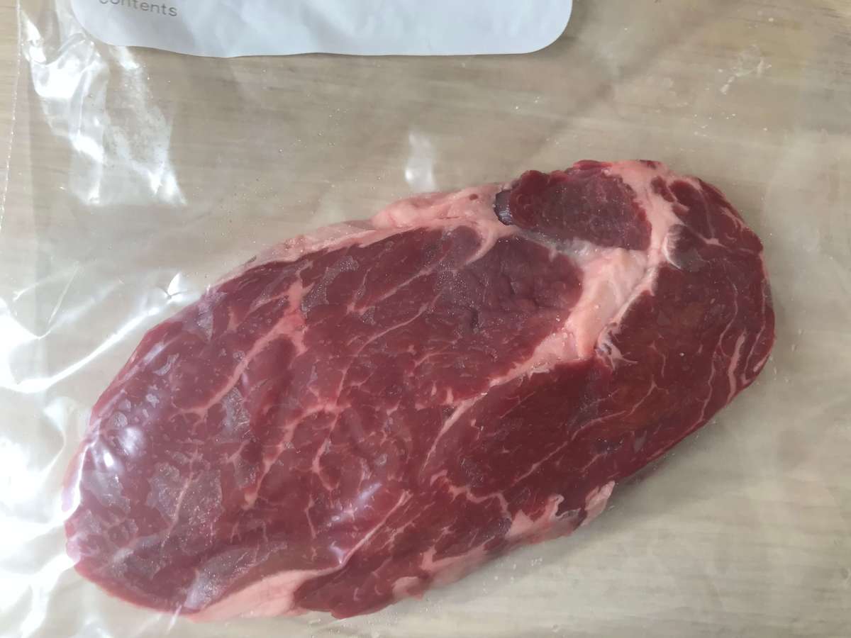 ステーキ肉(150g)を密閉式の保存袋に入れましょう。今回は、200gで厚さは2㎝のお肉を使いました。