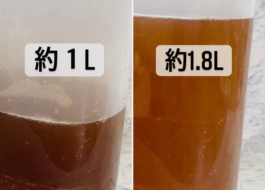 濃さは好みによりますが我が家はいつも薄めなので味より量の1.8Lで作ることになりそうです。