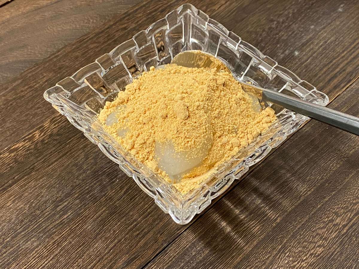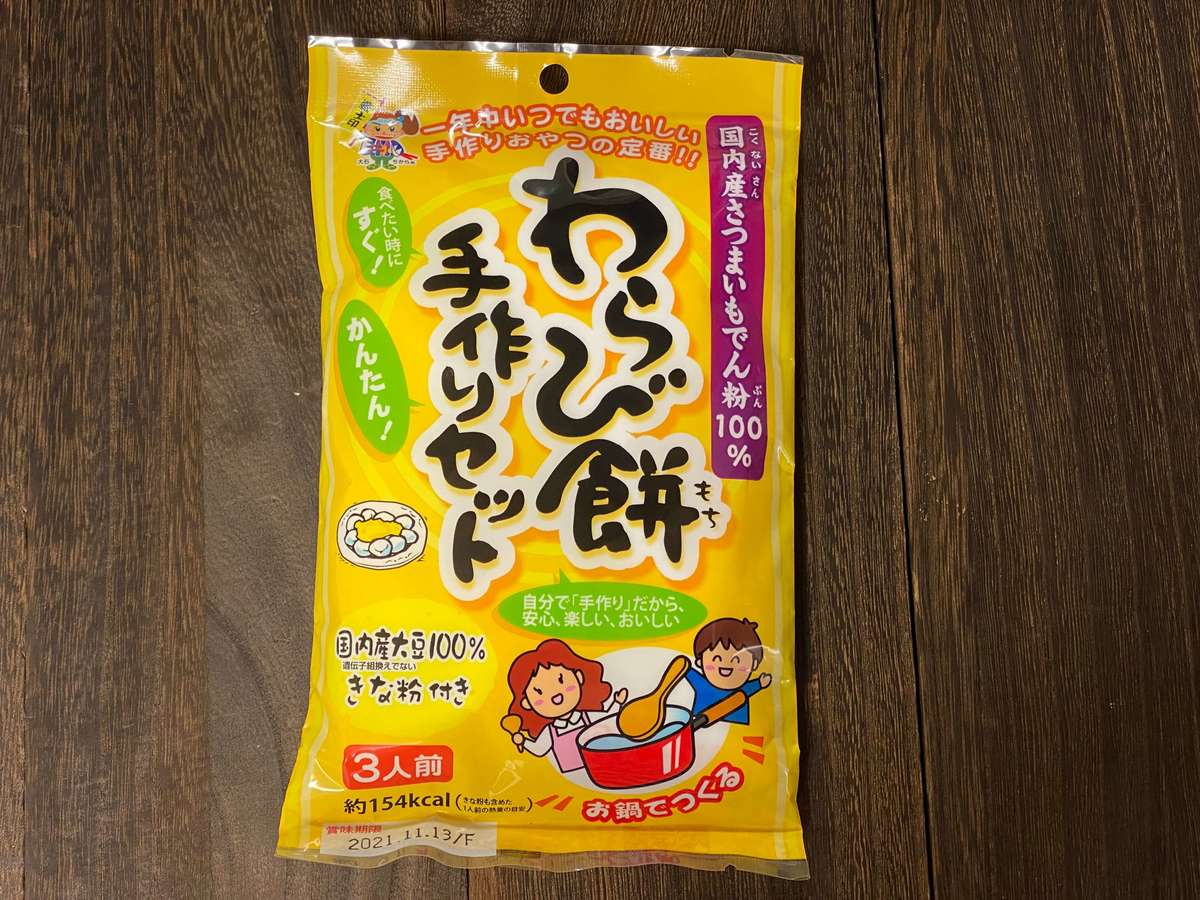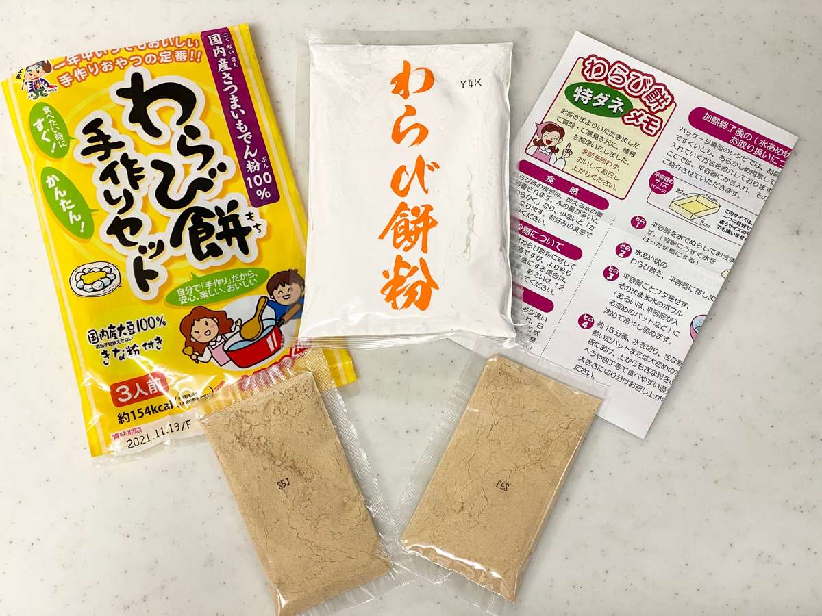わらび餅粉ときな粉が入っています。これ以外に必要なのは水のみなので、食べたい時にサッと作れます。