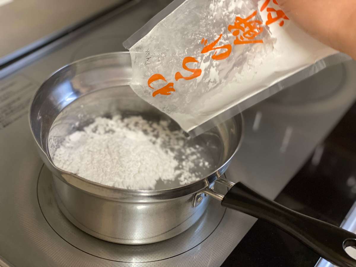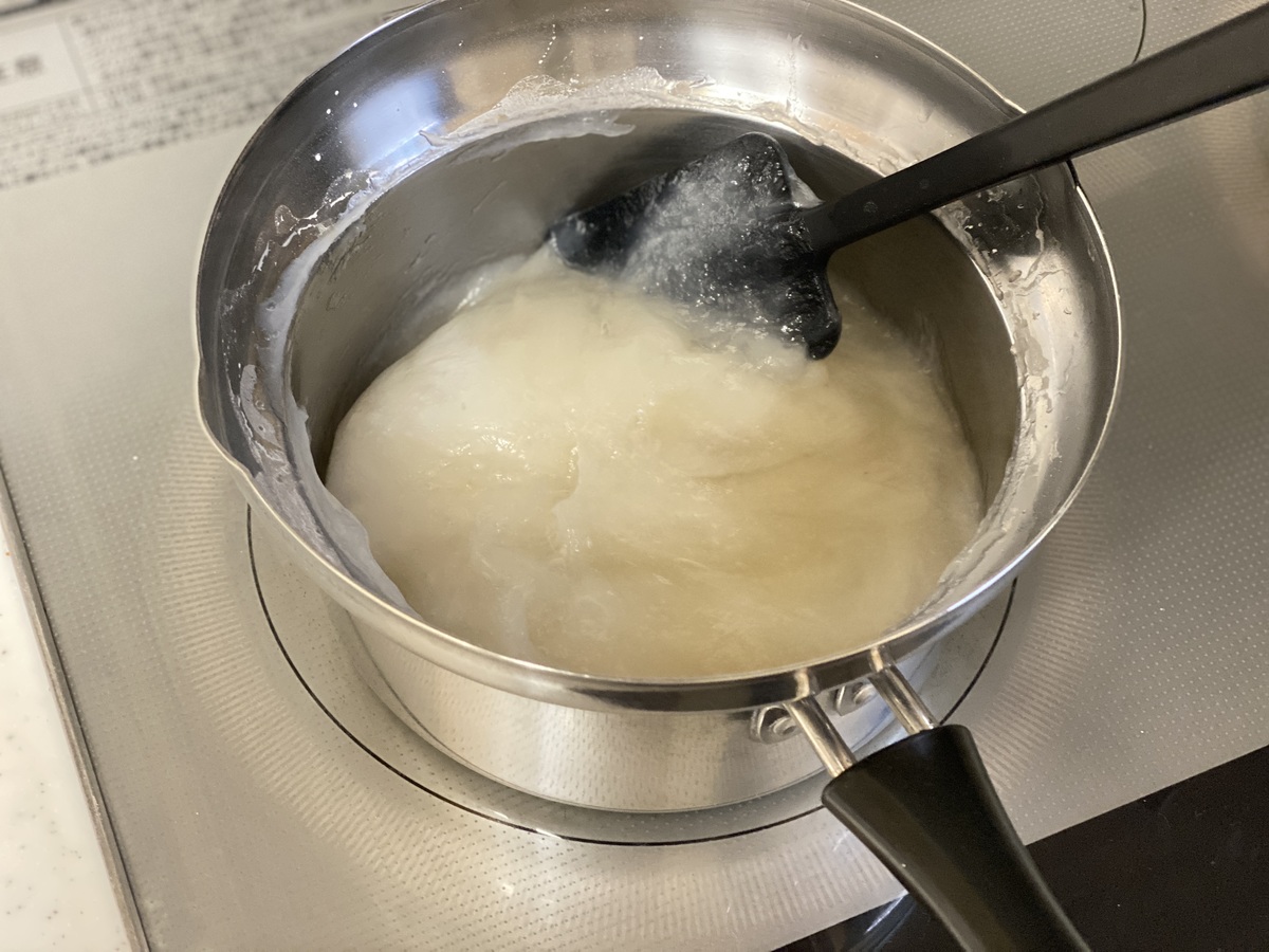 水400mlにわらび餅粉をいれて、よく混ぜながら火にかけます。火にかけているうちに、だんだん透明な塊ができてきますよ。