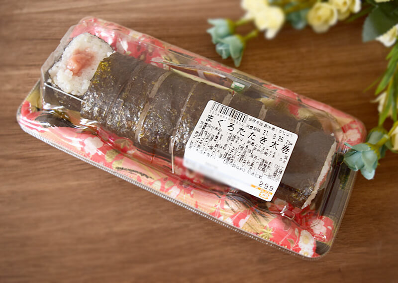 そんな中、発見したのが「まぐろたたき太巻き」299円(税込)です。まぐろ系の太巻き、近所のスーパーでは398円(税込)でみかけることが多いため、個人的には安いと思いました。