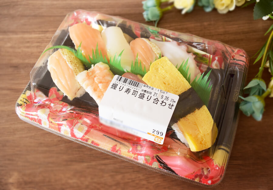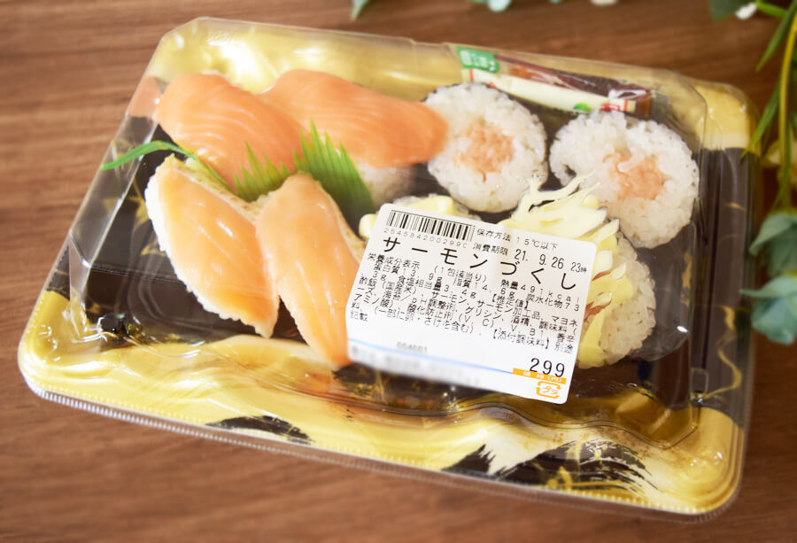 私が利用した店舗では、握り寿司や太巻きを多数取り扱っており、どれをみても299円(税込)と目を疑う値段です。店舗によって取扱品は異なるとは思いますが、激安をウリにしていないスーパーよりもやや安め。