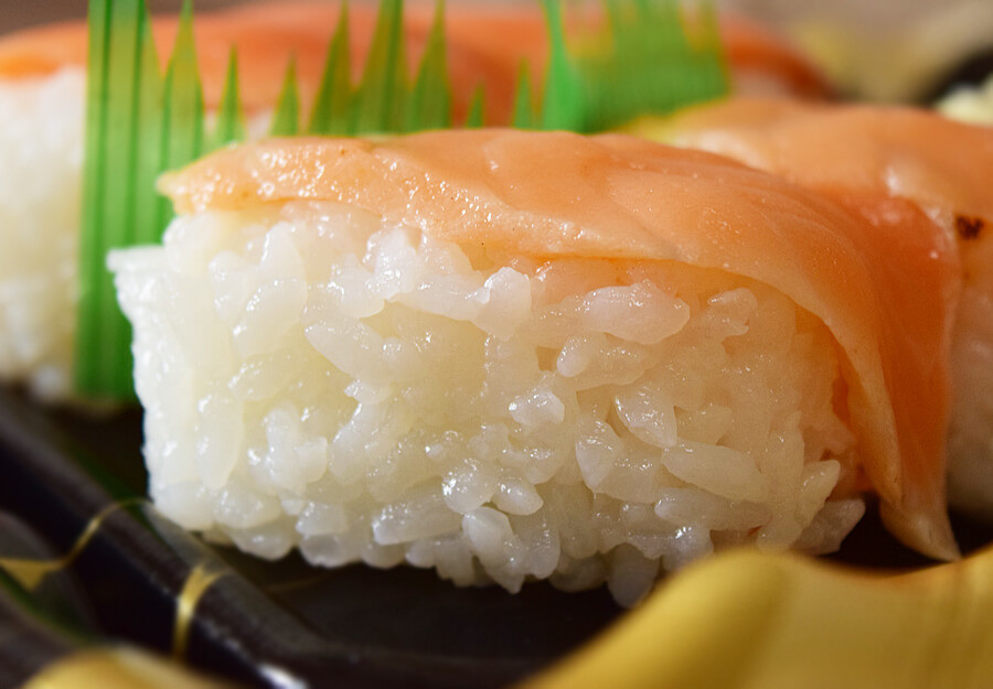 横から見るとおわかりいただけると思いますが、サーモンのネタが薄っぺらいんです。その代わりに酢飯の高さがあります。